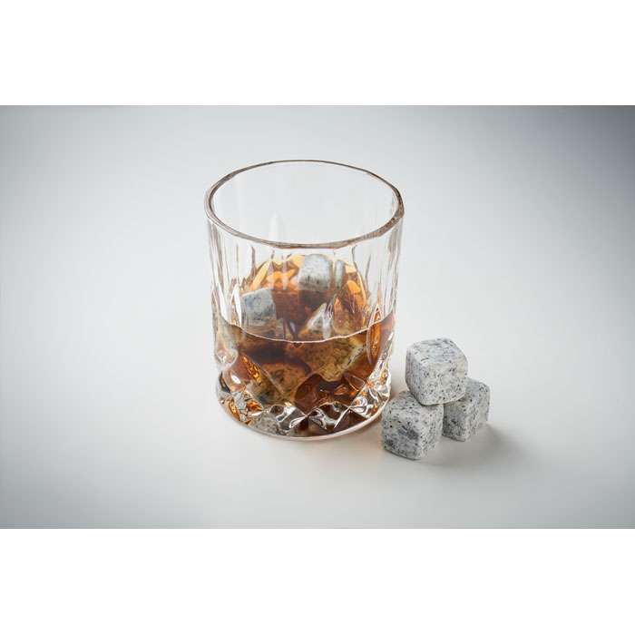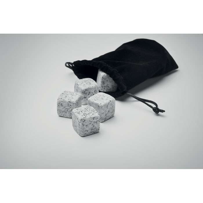 Återanvändbar stenisbitar i furuträbox. Innehåller 9 isbitar med stenar och sammetspåse.