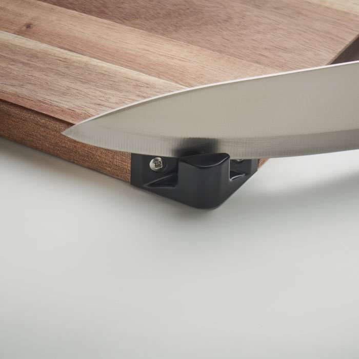 Skärbräda i akaciaträ med knivslipare.