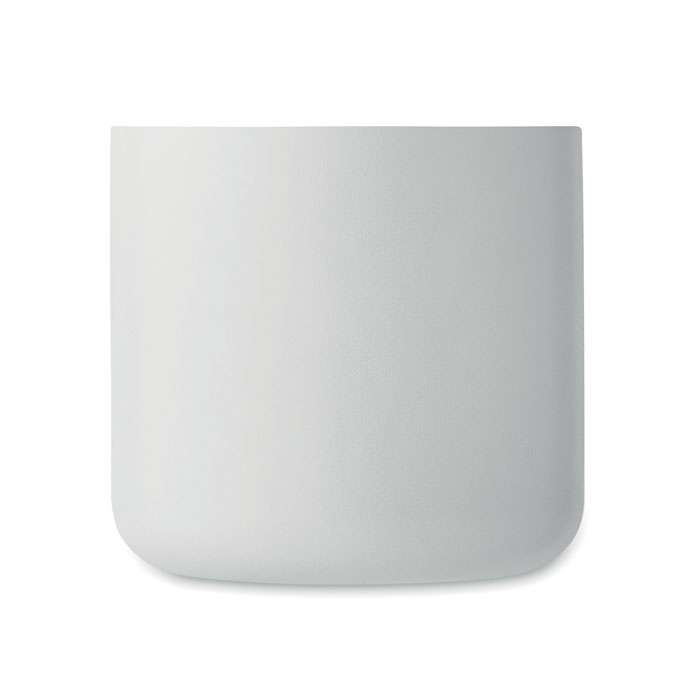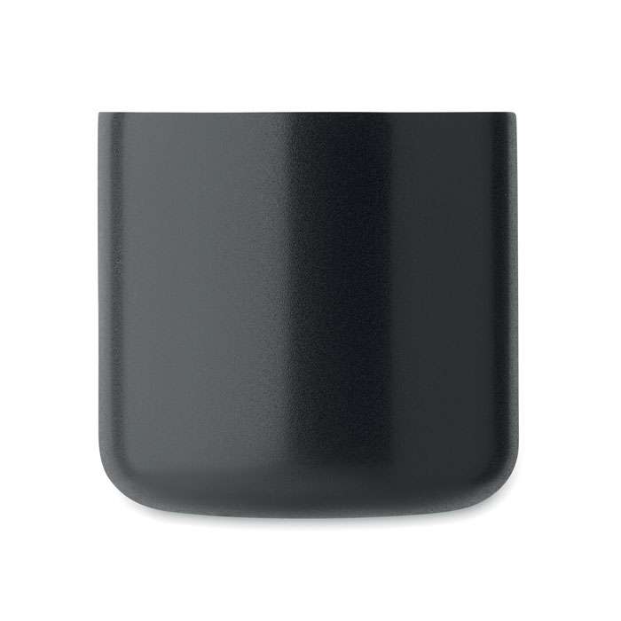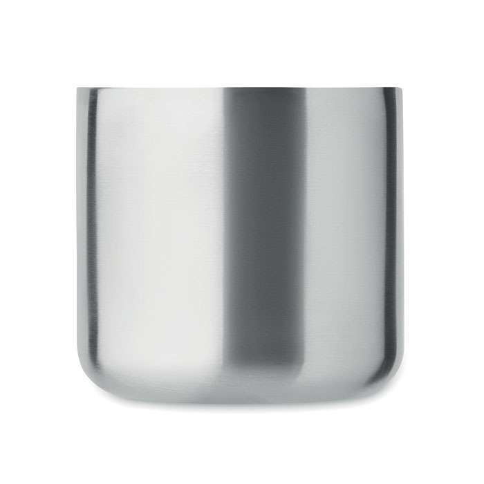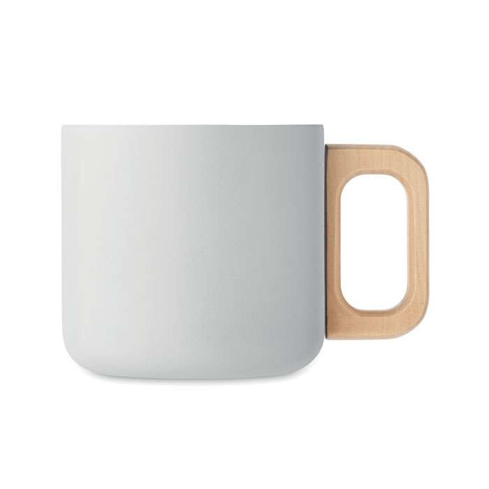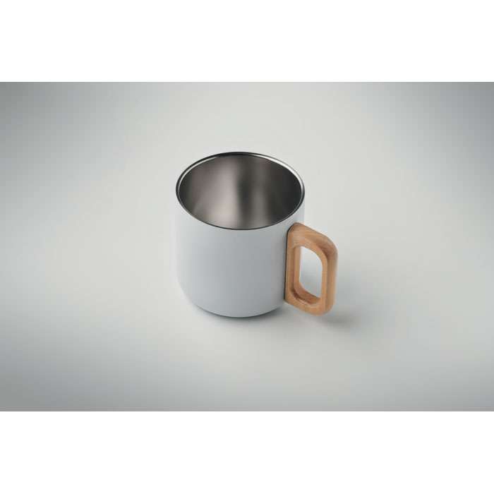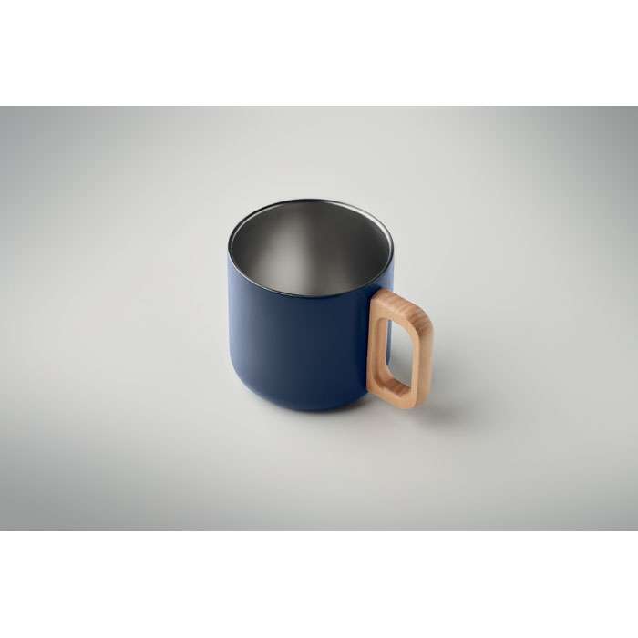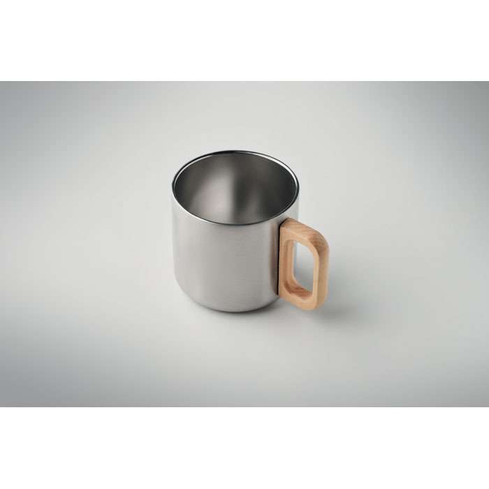 Mugg med dubbelvägg i återvunnet rostfritt stål (90% återvunnet rostfritt stål och 10% rostfritt stål) mugg med trähandtag. Volym: 350 ml.