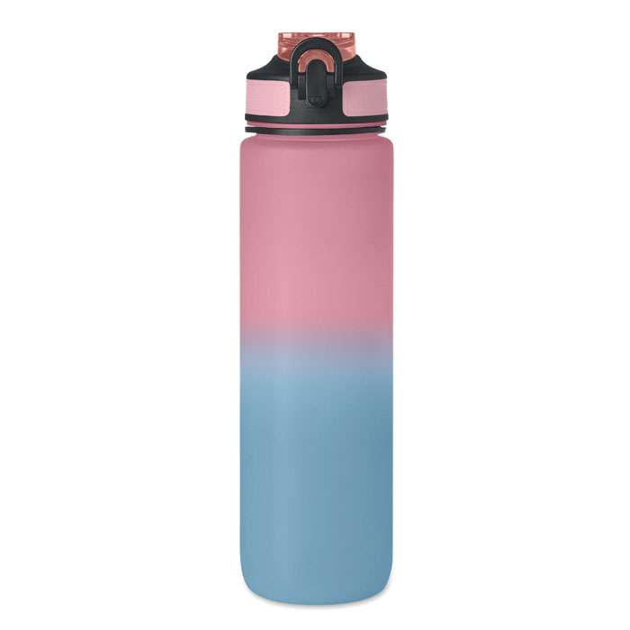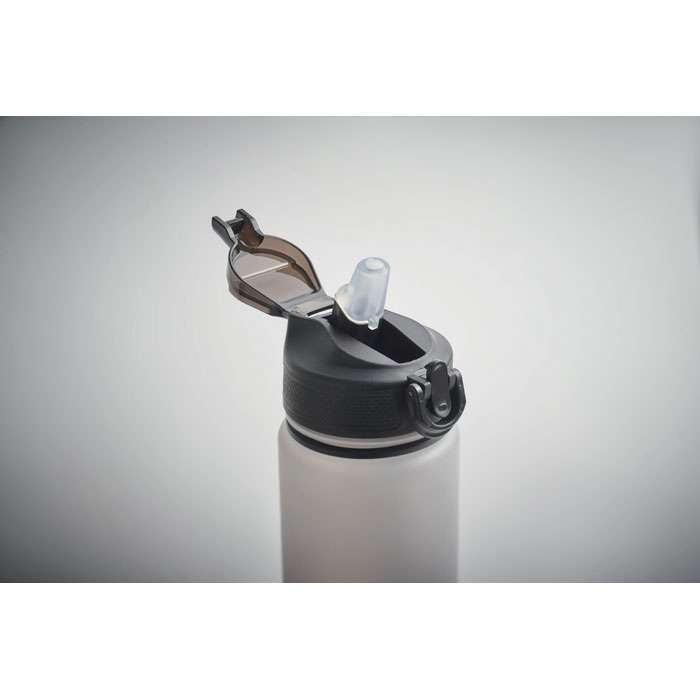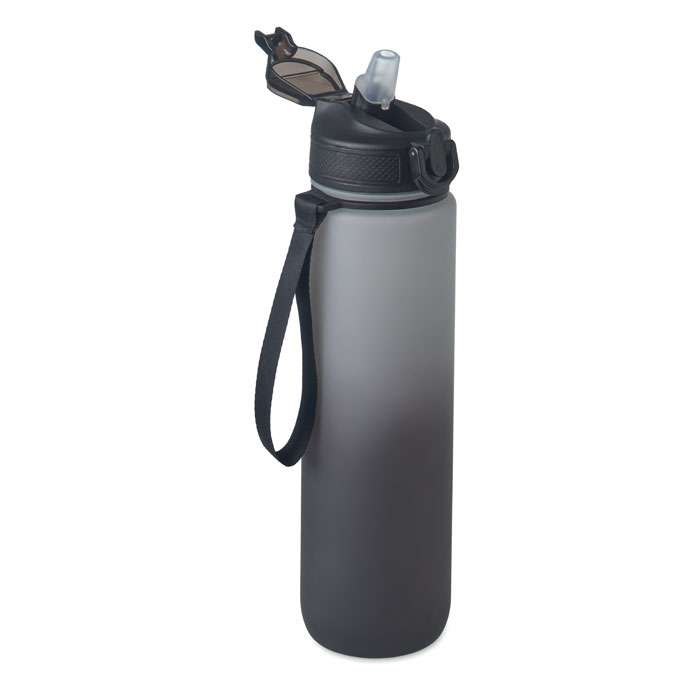 Sportvattenflaska i RPET med integrerat sugrör, munstycke i mjuk silikon, tidsmarkering, flip top-lock som kan öppnas med en hand, säkerhetslås och bärrem. Läcksäker. Volym 1L.