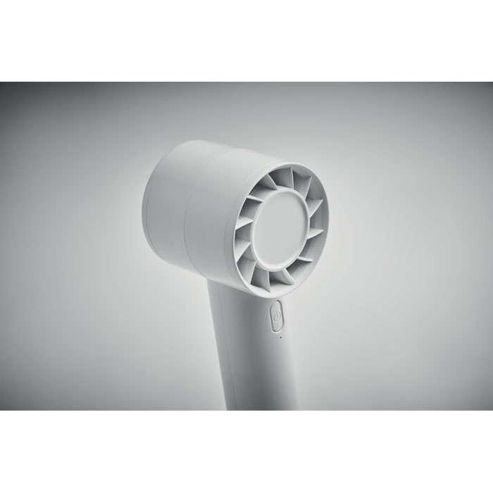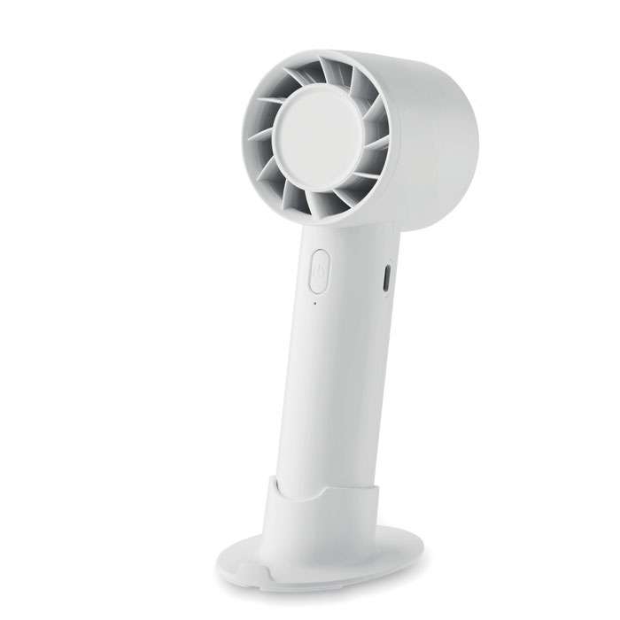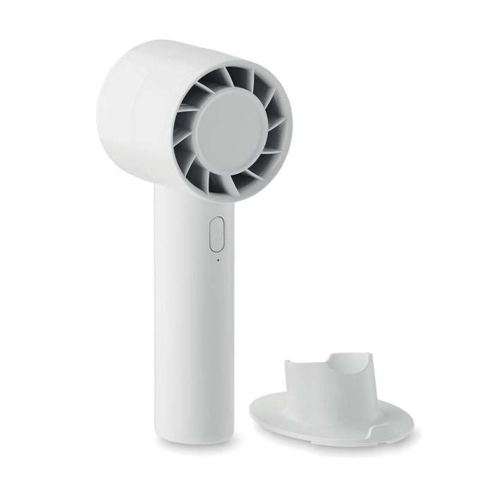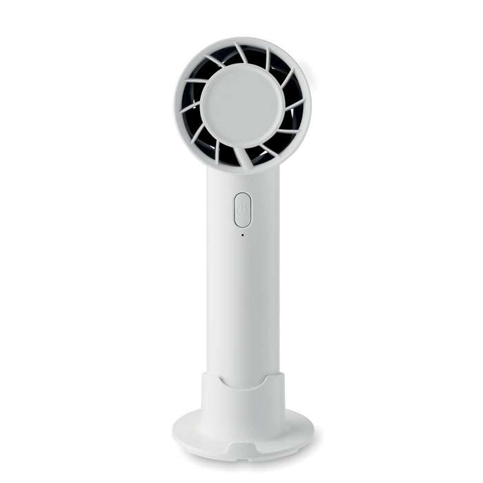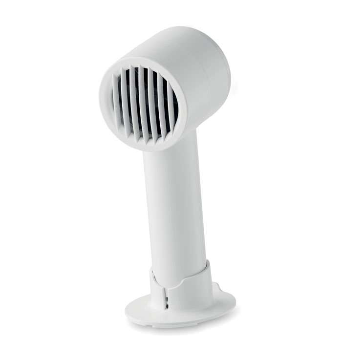 Liten portabel fläkt med extra skrivbordsstativ med möjlighet till telefonstativ. 3 hastighetsinställningar. Uppladdningsbart batteri 2000 mAh via USB-port.