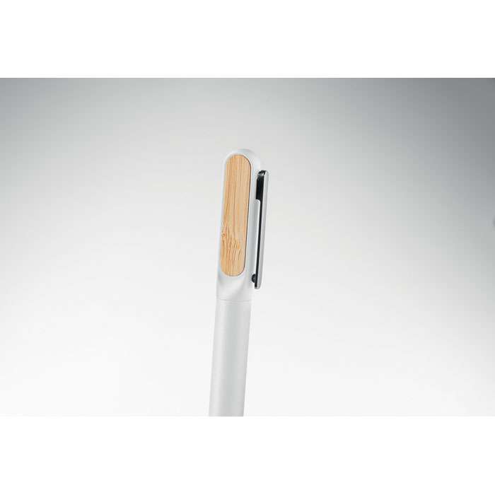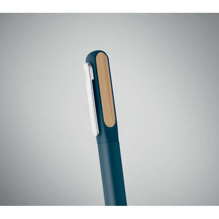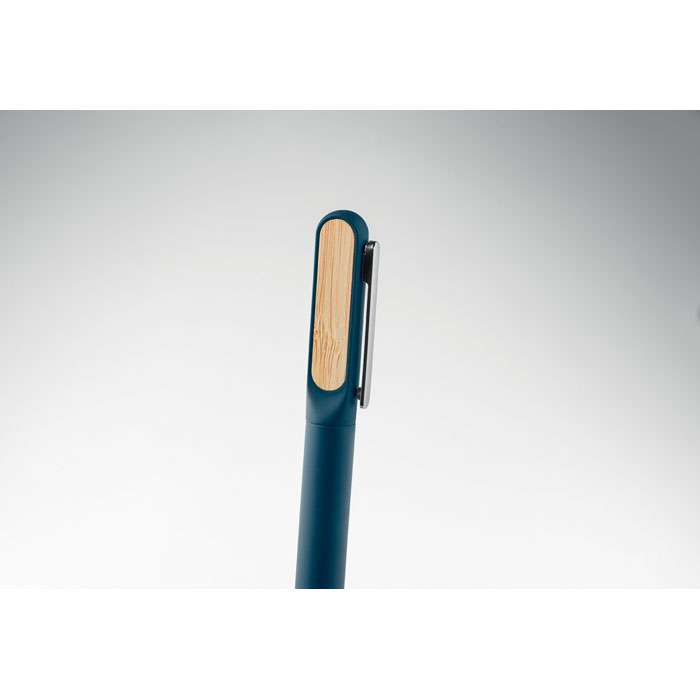 Penna med vridmekanism och kropp av återvunnen aluminium, mekanism av återvunnen ABS och metallklämma med bambudetalj. Blått bläck.