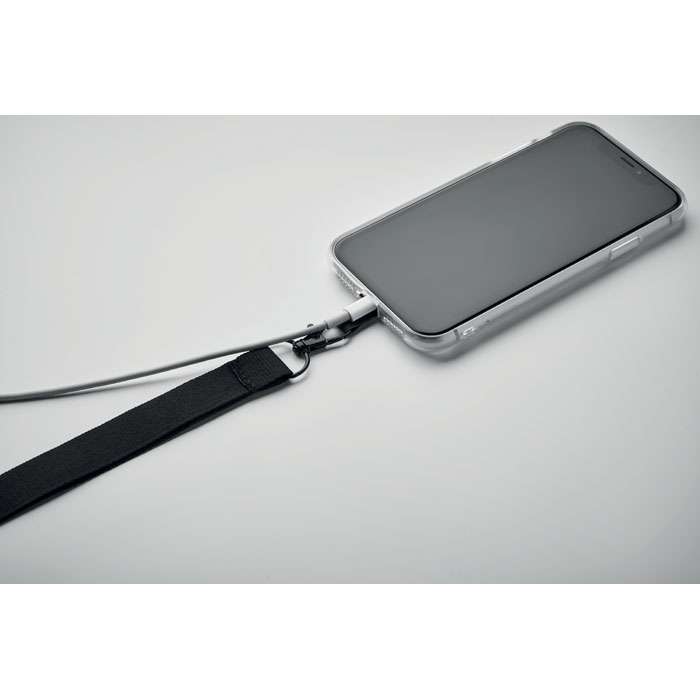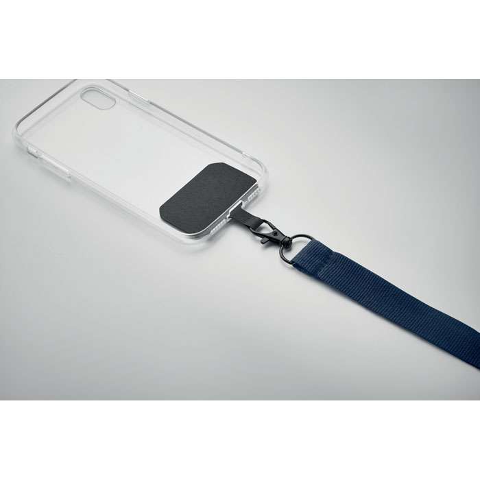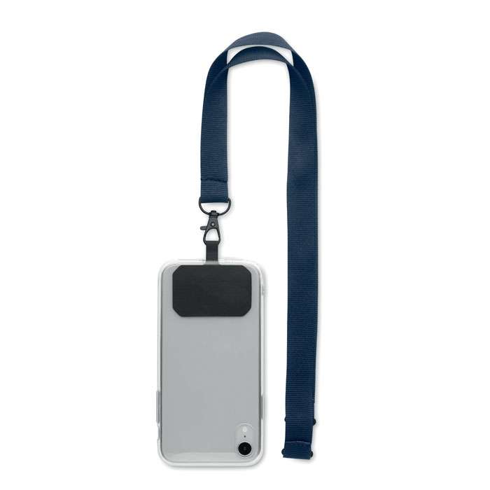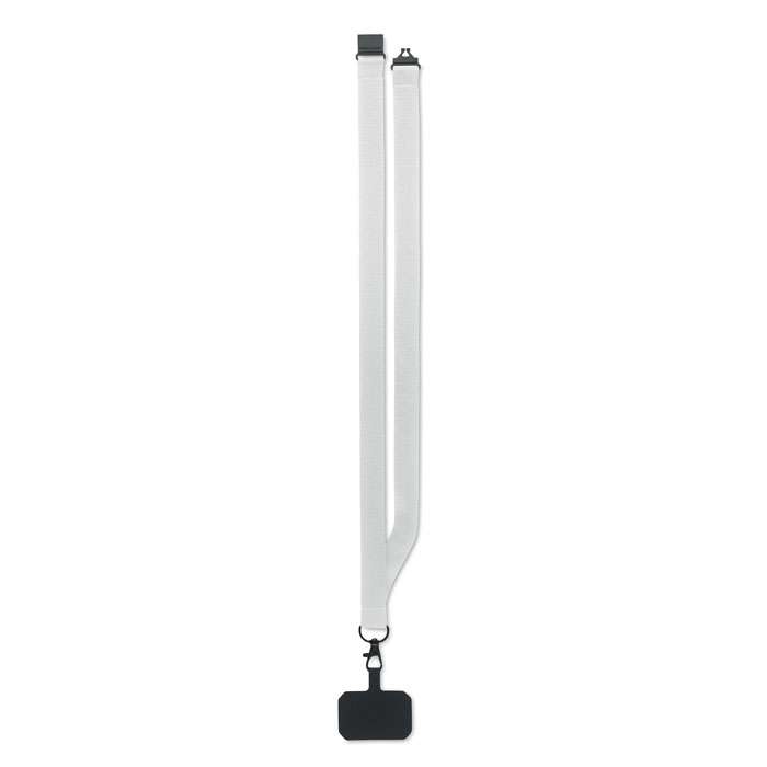 Nyckelband i polyester med telefonhållare och säkerhetsspänne. 2 cm.
