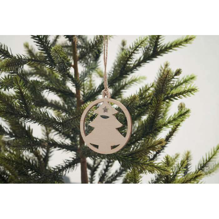 Julpynt i form av ett träd med jutesnöre och granfrön. Presenteras i kraftkuvert.