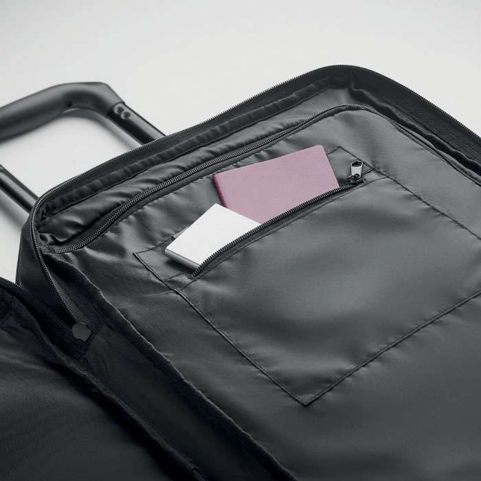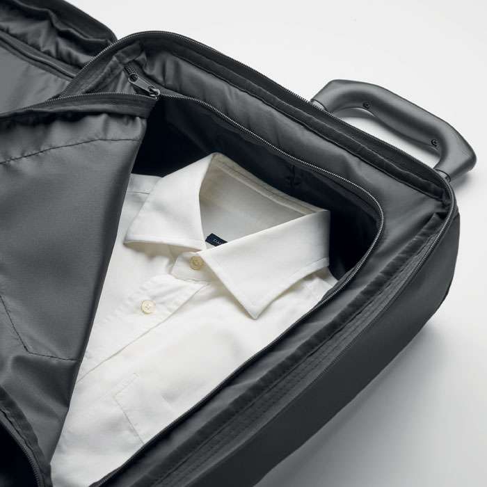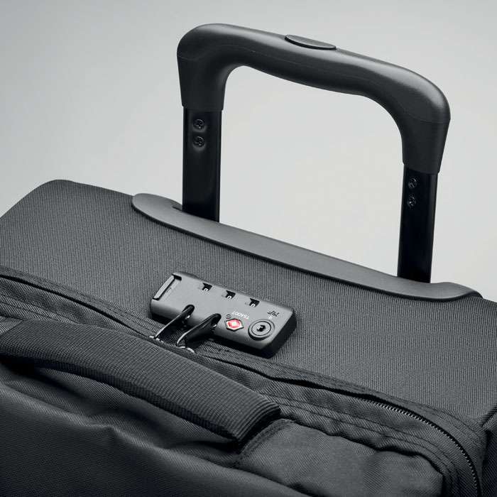 Trolley med mjuka sidor i 600D RPET polyester. Två stora innerfack med dragkedja. En frontficka med dragkedja samt handtag på ovansidan, sidan och undersidan. Inklusive ett kombinationslås och en ram med dubbla rör.