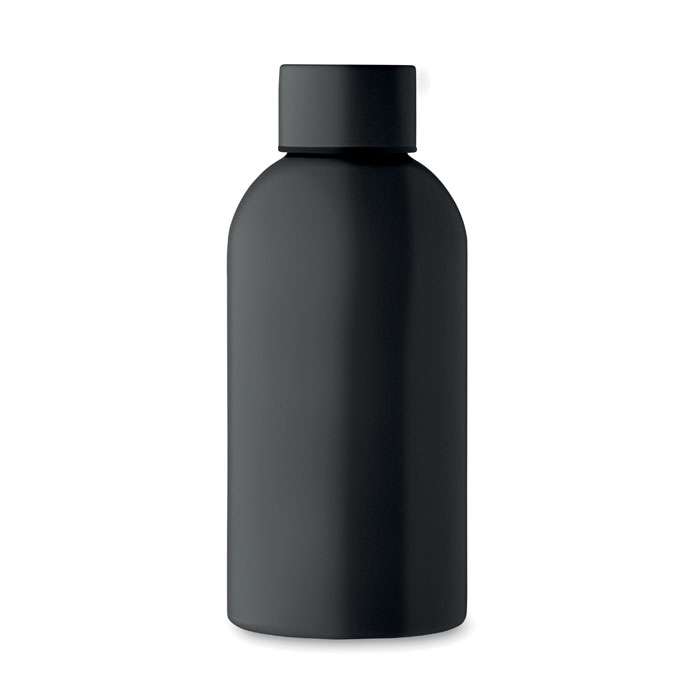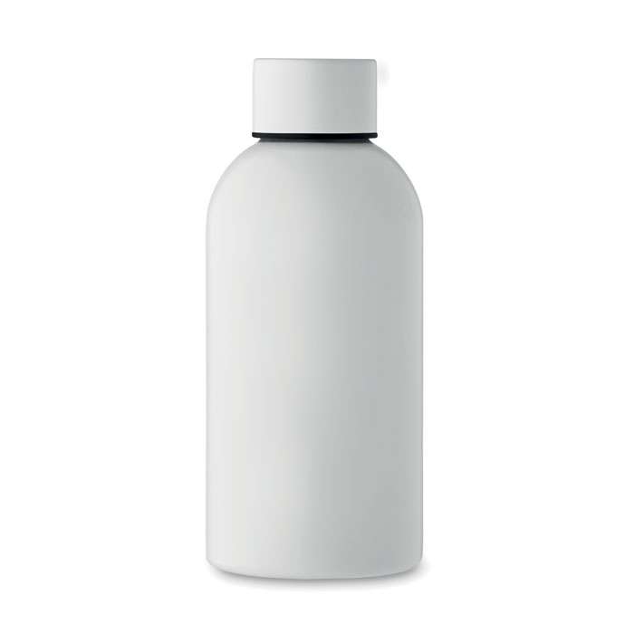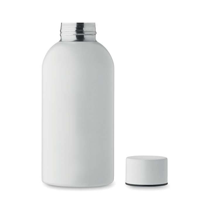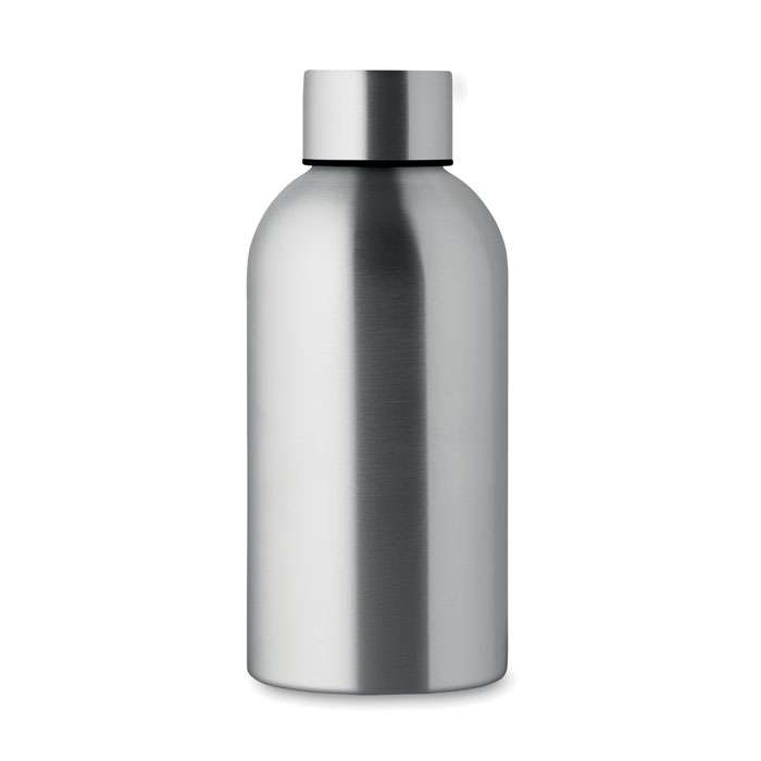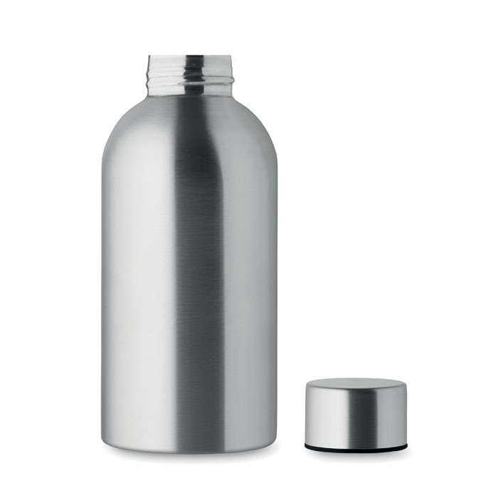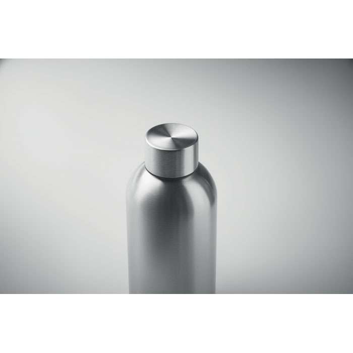 Enkelväggig flaska i återvunnet rostfritt stål (90% återvunnet rostfritt stål och 10% rostfritt stål). Läckagefri. Volym 500 ml. Silikongreppet ger dig ett bra grepp och skyddar dina händer från att bränna sig.