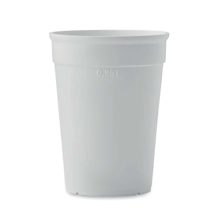 Återanvändbar enkelväggig kaffekopp i PP. Kapacitet: 250 ml. Silikongreppet ger dig ett bra grepp och skyddar dina händer från att bränna sig.