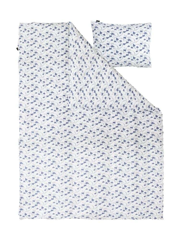 Krispigt bäddset i bäckebölja. Småmönstrat med slingrande rankor, blad och blommor i sommarblått mot vit botten.