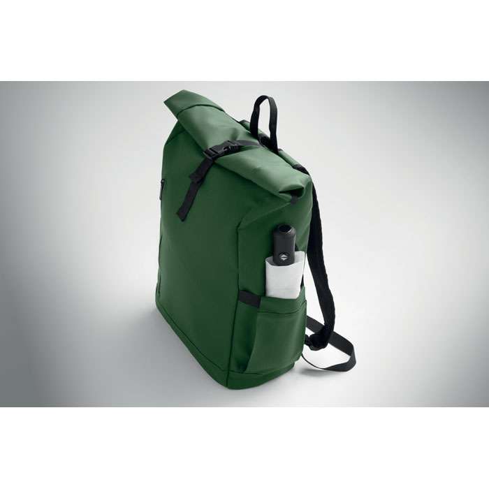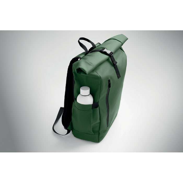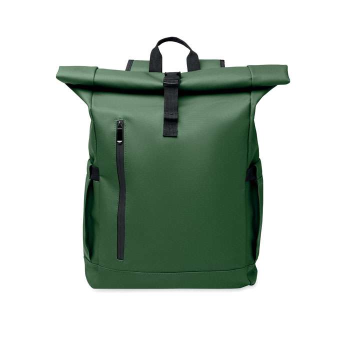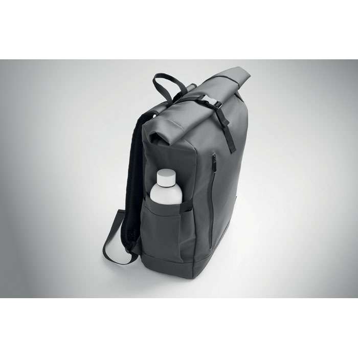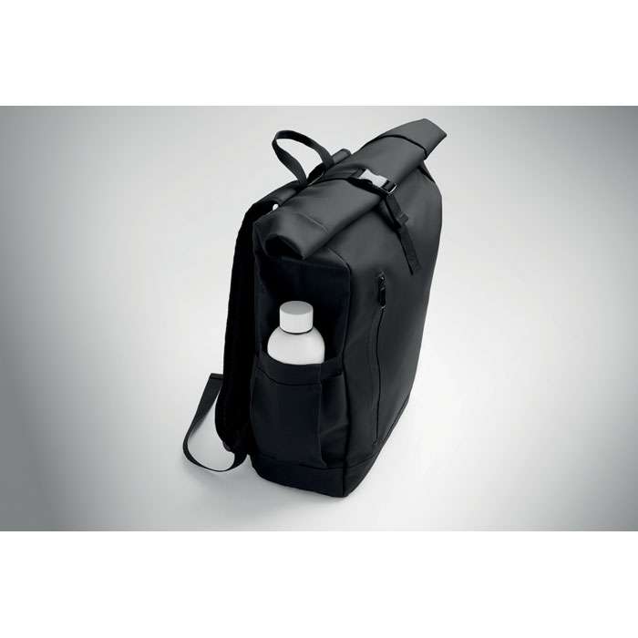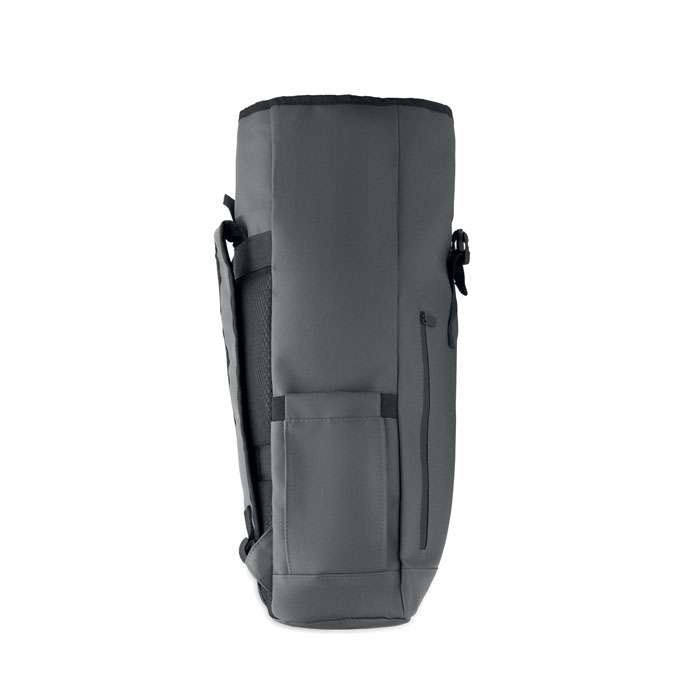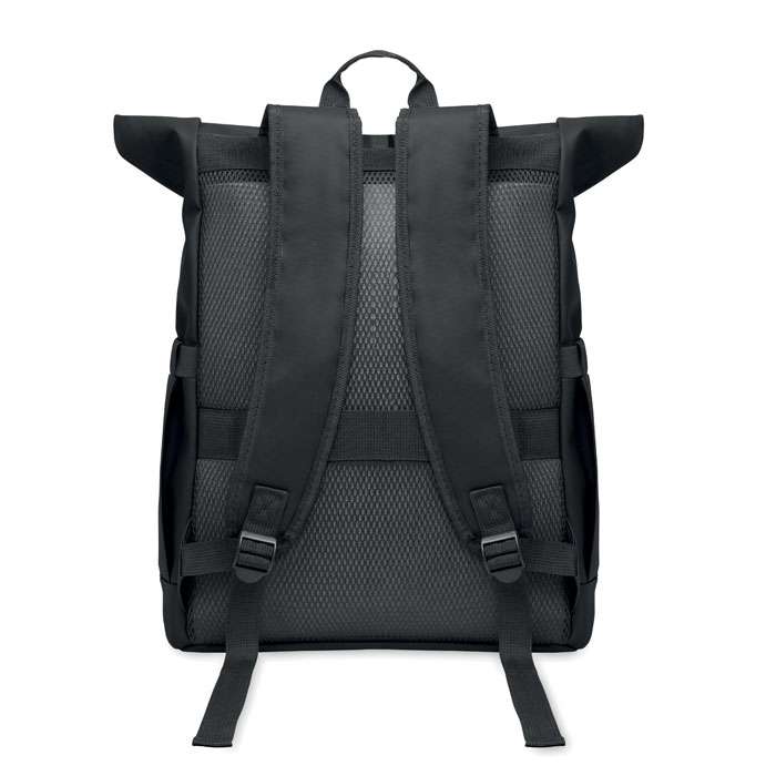 15” rulltopp dataryggsäck i PU-belagd 600D RPET polyester och RPET polyesterfoder. Meshed vadderad rygg med ficka med dragkedja och vagnsrem. Vadderad axelrem med mesh på insidan.