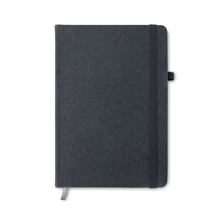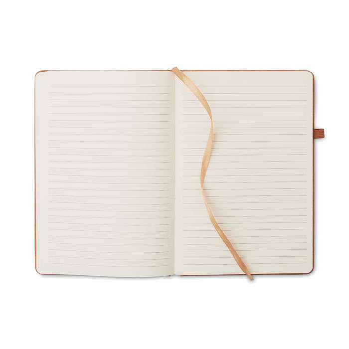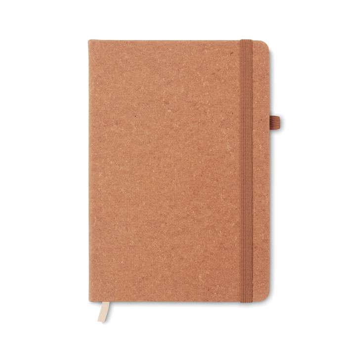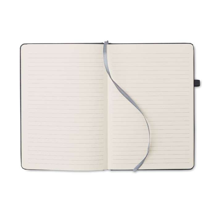 A5-anteckningsbok med omslag av 70% återvunnet läder och 30% latex-PU. Bunden pärm, 160 linjerade sidor i återvunnet papper (80 ark). Matchande elastisk band och pennhållare.