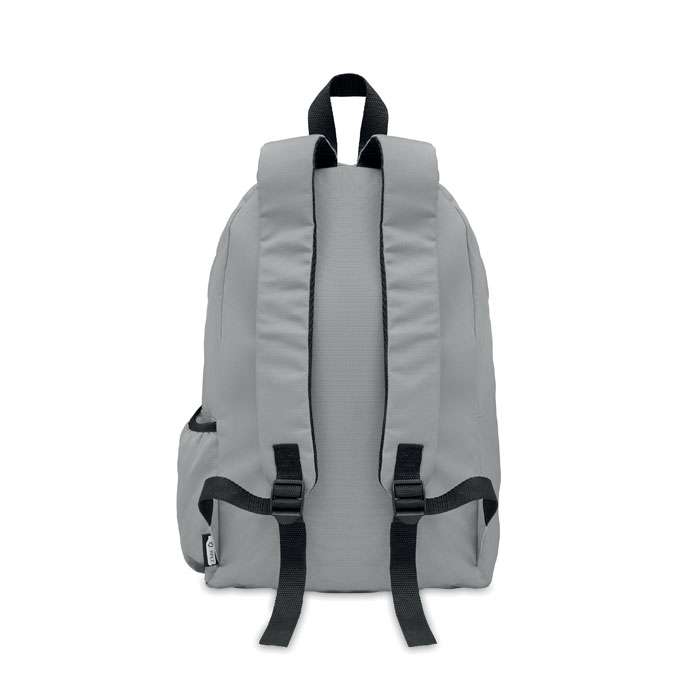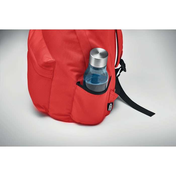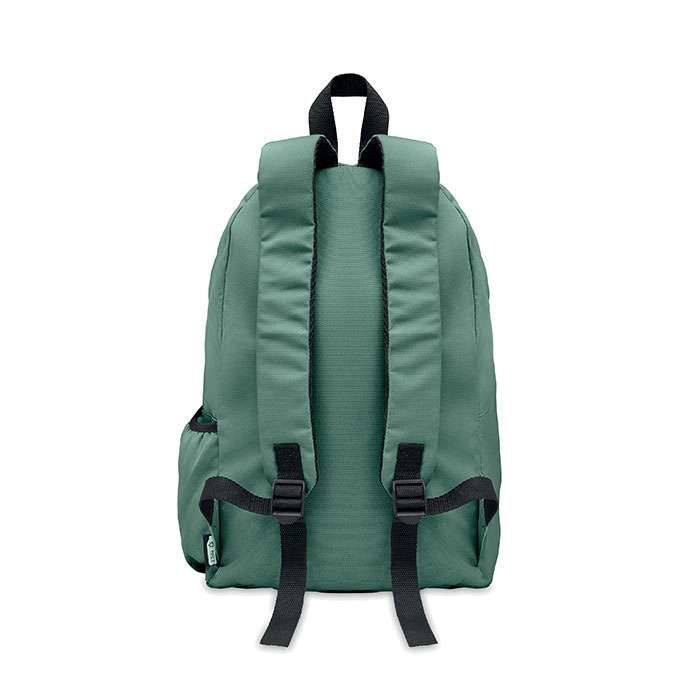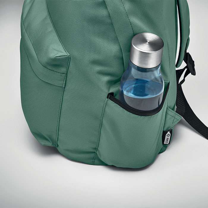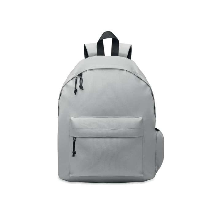 Ryggsäck i 600D RPET polyester med ytterficka med dragkedja. Vadderad rygg och har ett flaskficka på sidan.