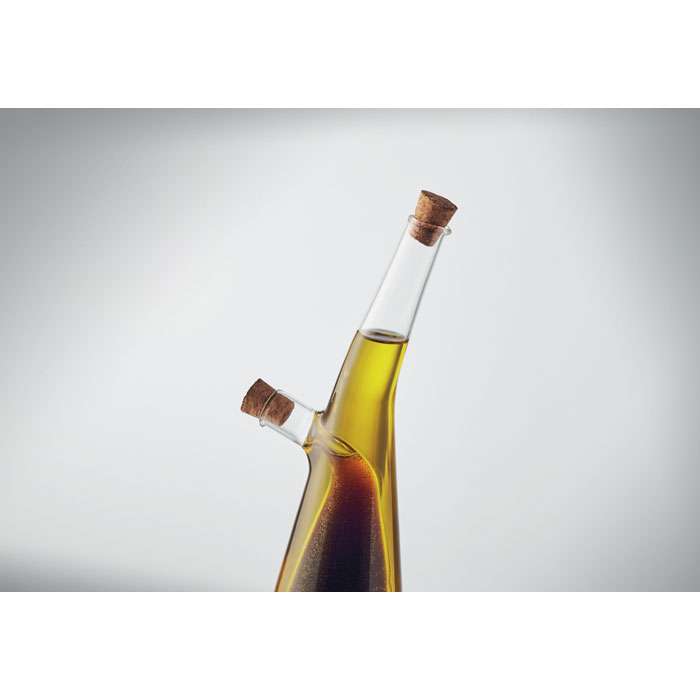 Olje- och vinägerflaska av borosilikatglas med korklock. Volym yttre: 300 ml. Inre volym: 80 ml.