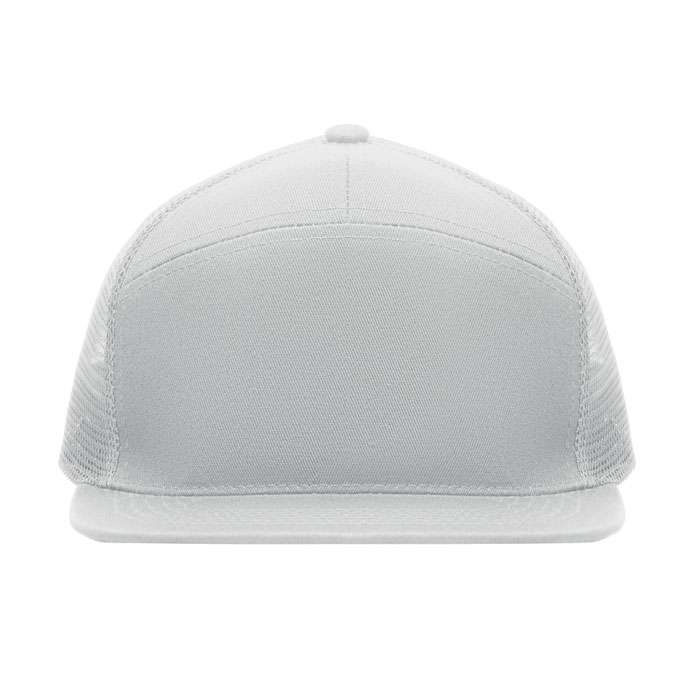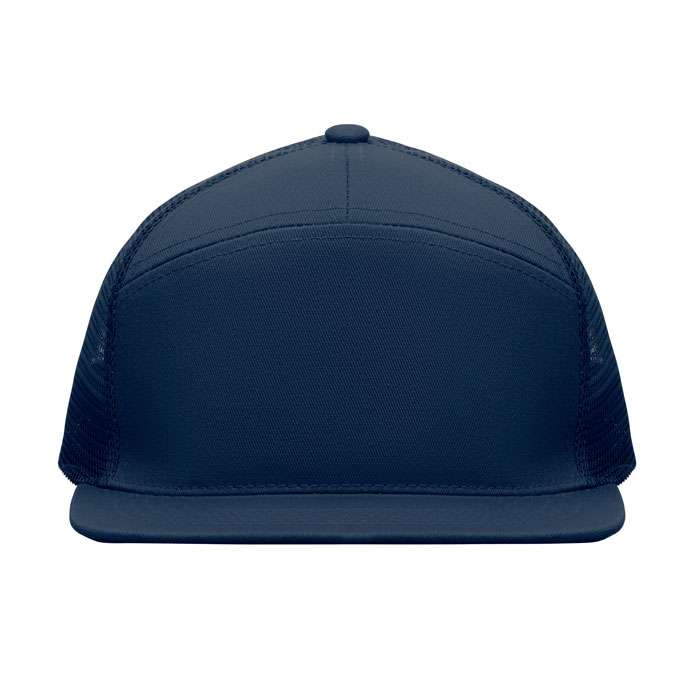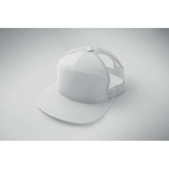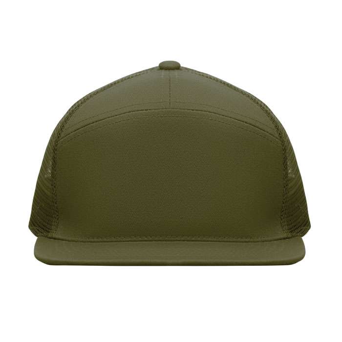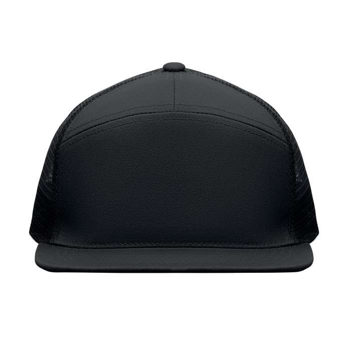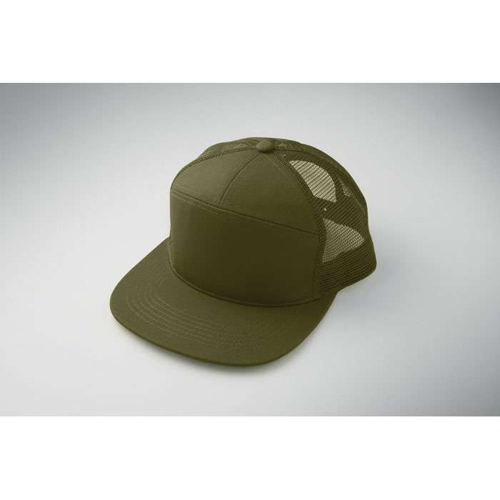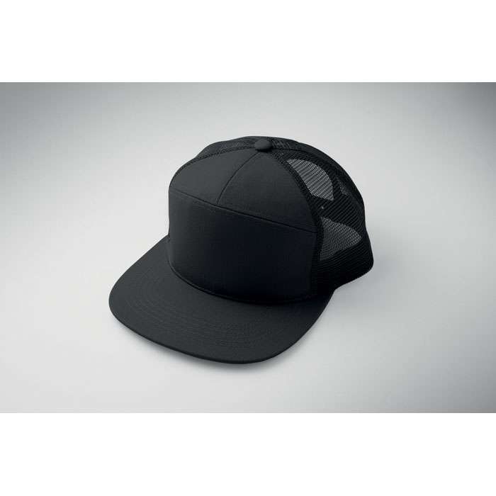 7 panelers keps i bomullstwill med baksida i polyestermesh och plastspänne. Platt skärm. 235gsm