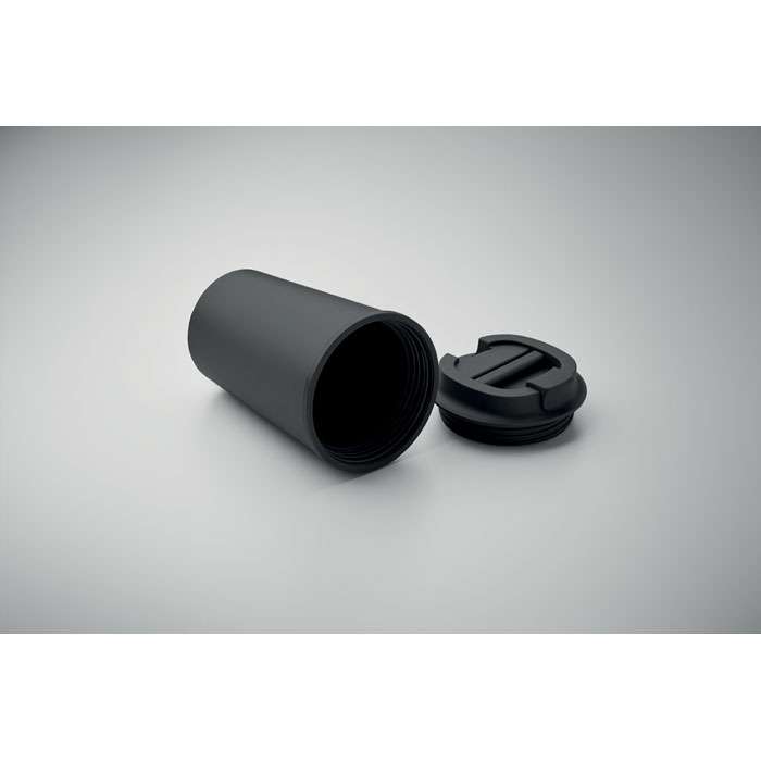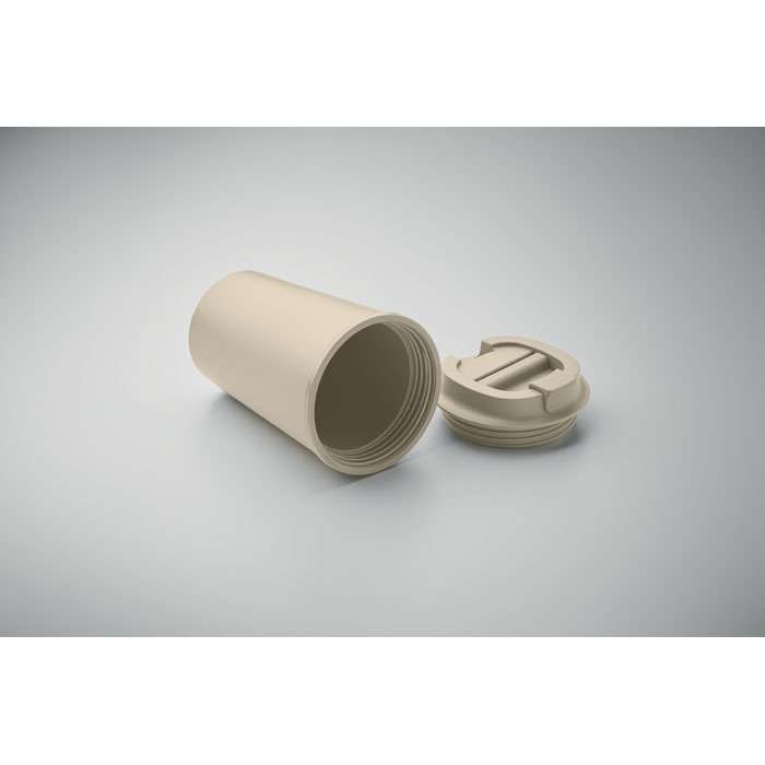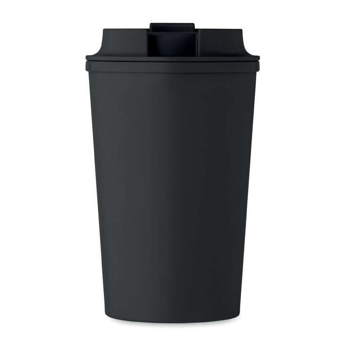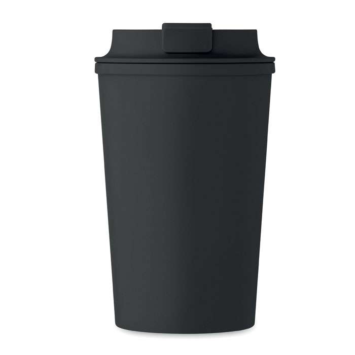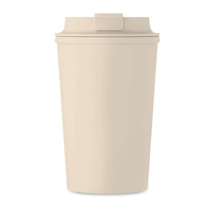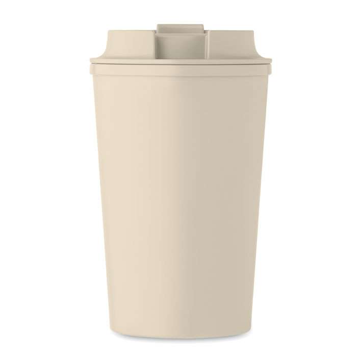 Dubbelväggig mugg i PLA-majs med lock i PP med invändig TPR. Volym: 350 ml.