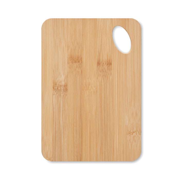 Skärbräda i bambusträ med upphängningshål.