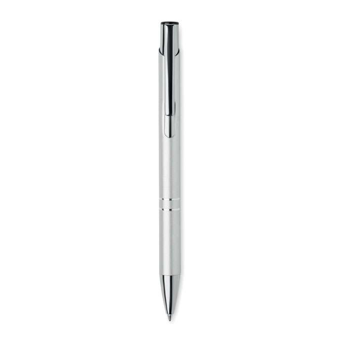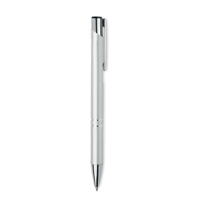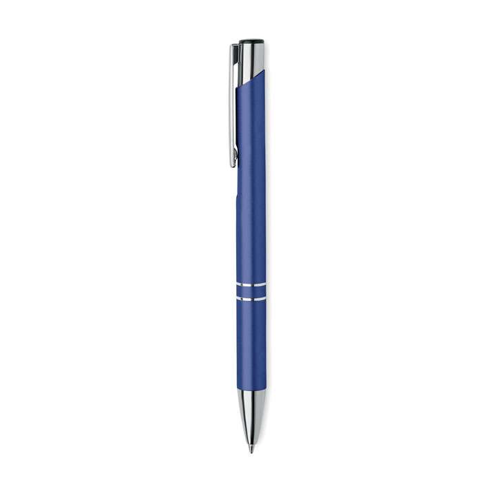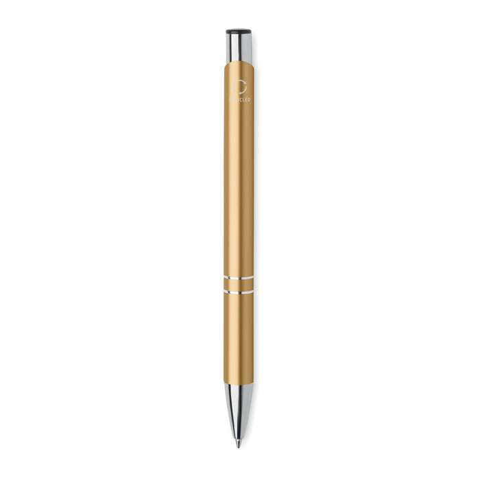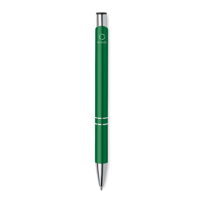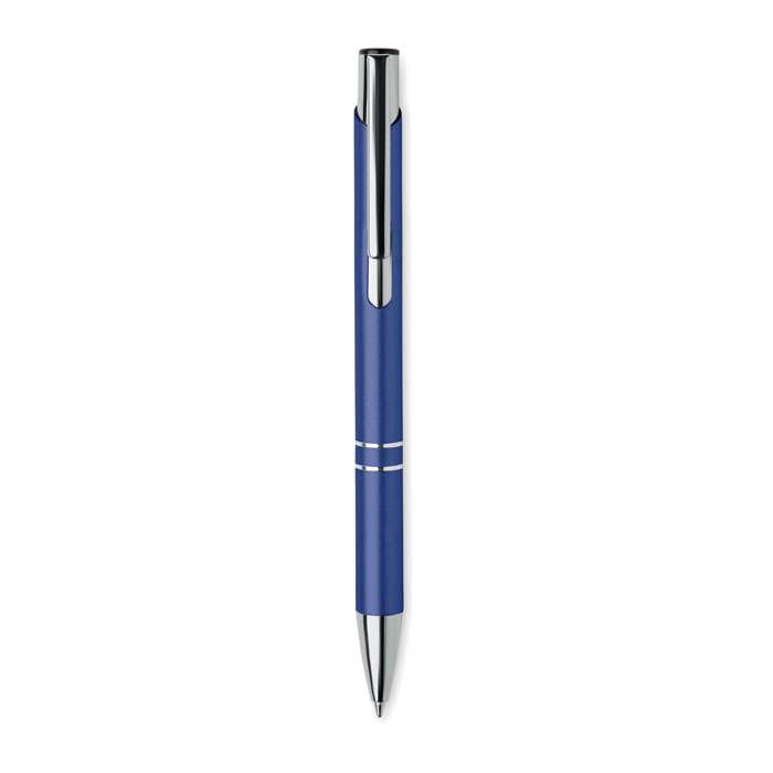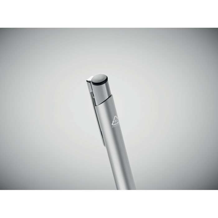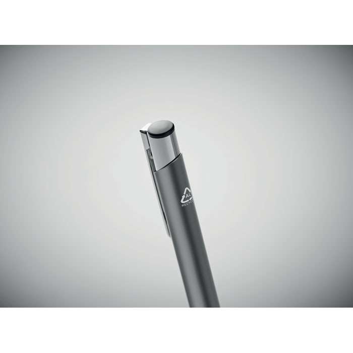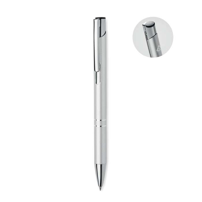 Kulspetspenna med tryckknapp i återvunnen aluminium. Blått bläck.