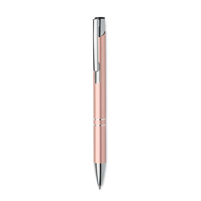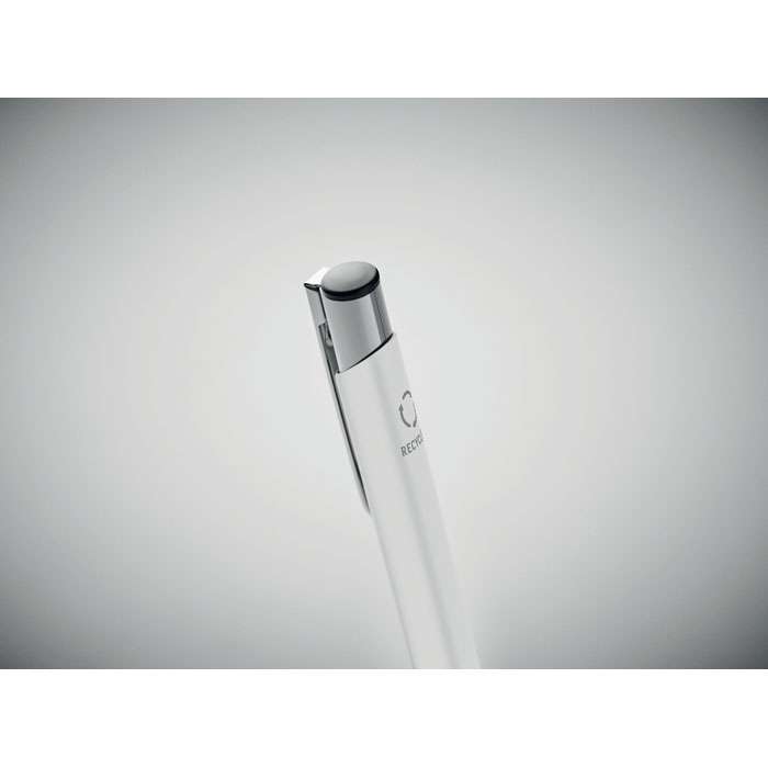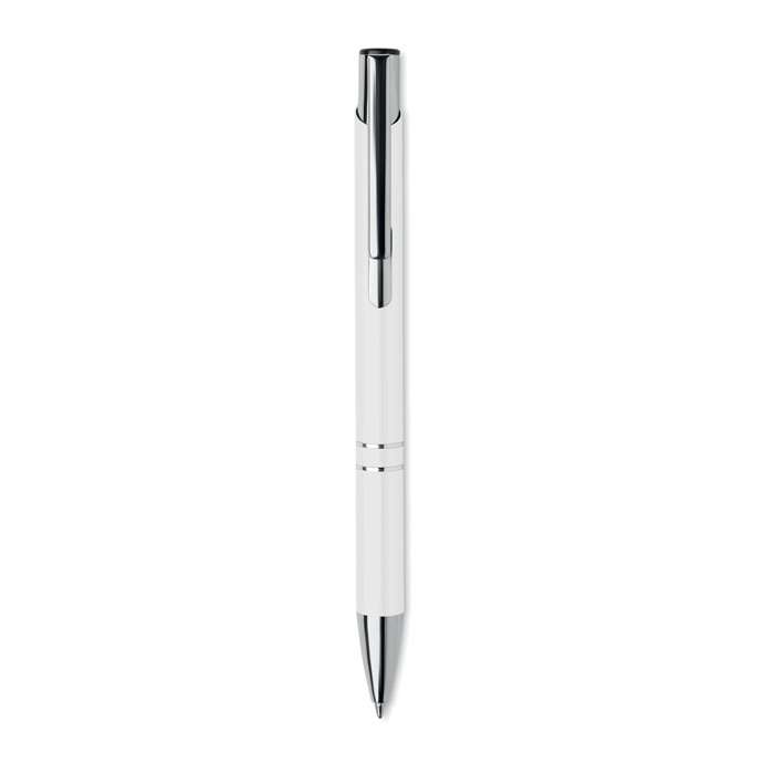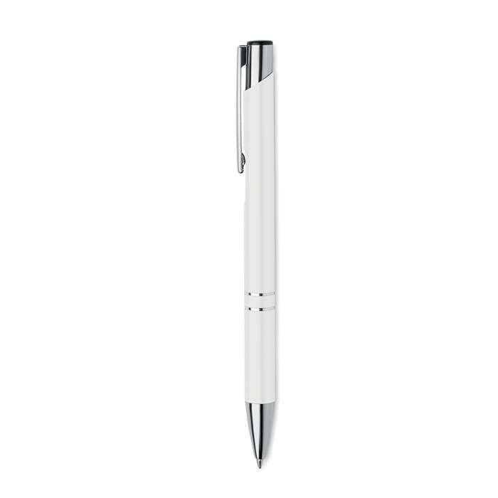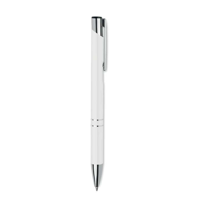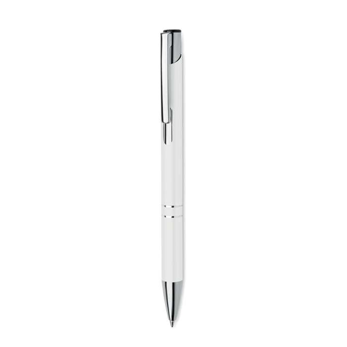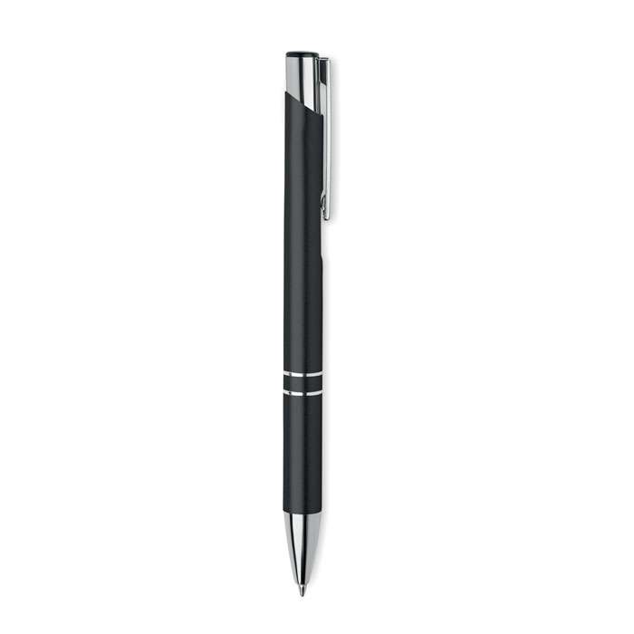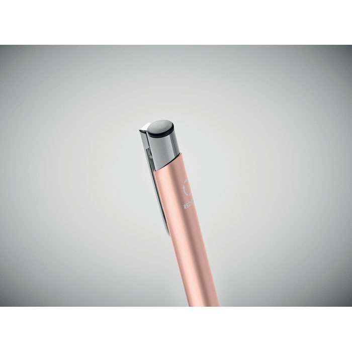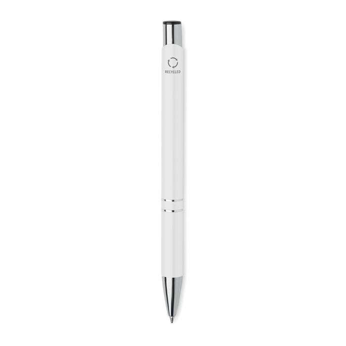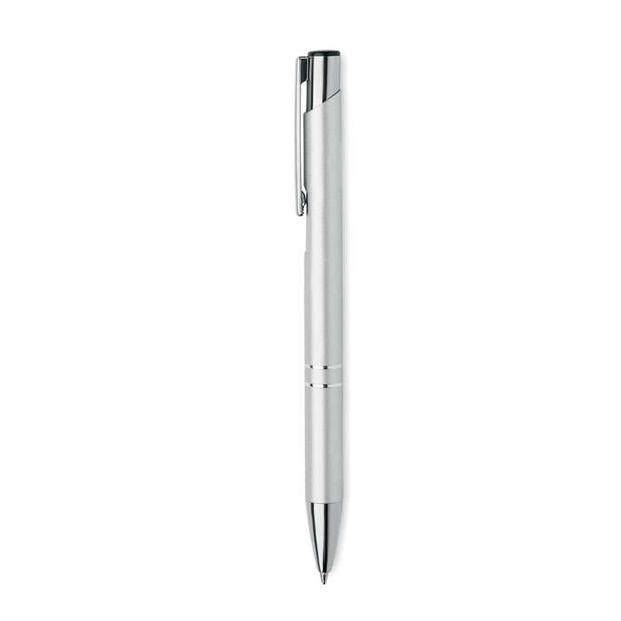 Kulspetspenna med tryckknapp i återvunnen aluminium. Blått bläck.