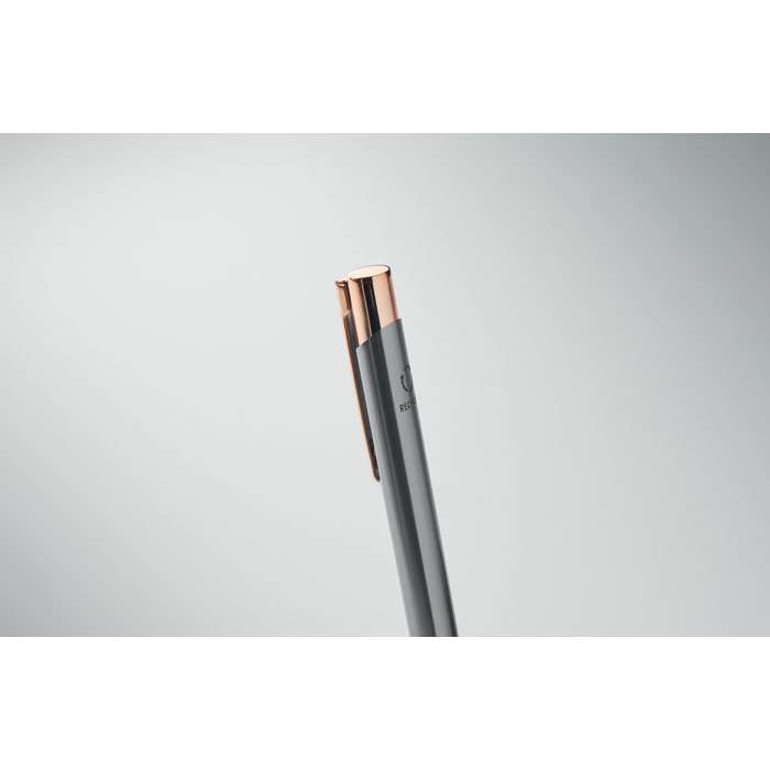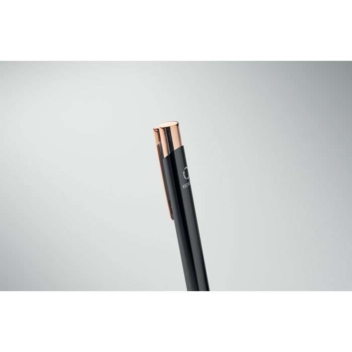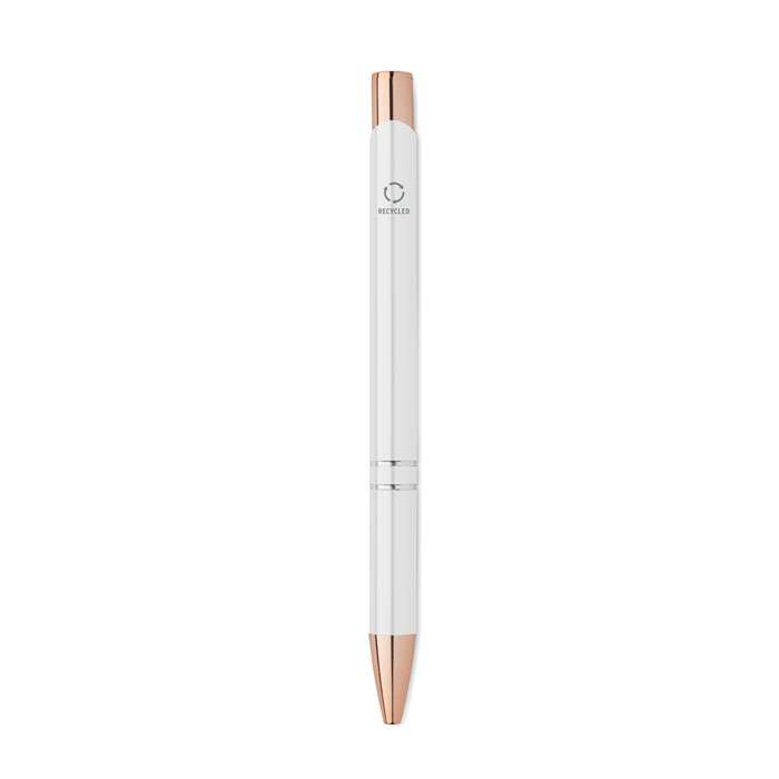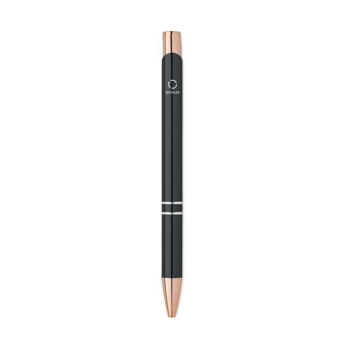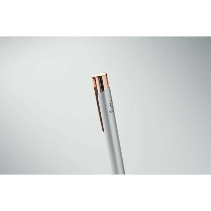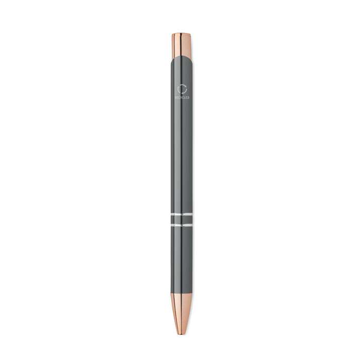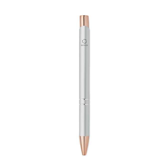 Kulspetspenna med tryckknapp i återvunnen aluminium. Blått bläck.