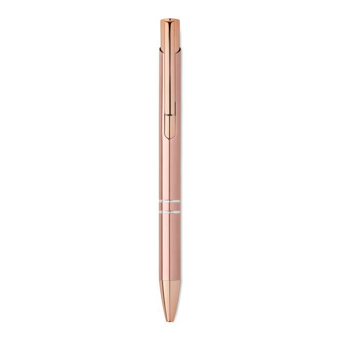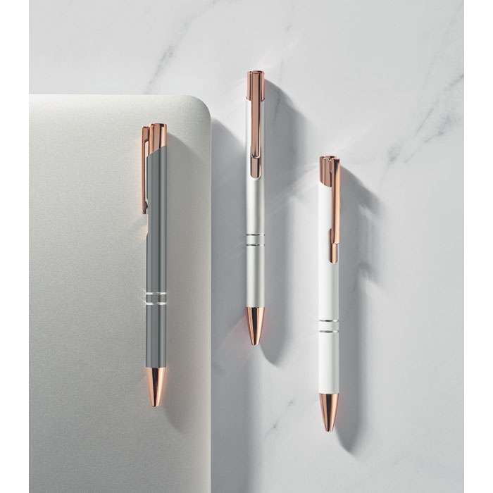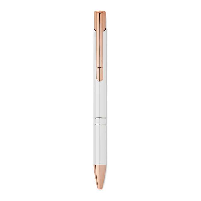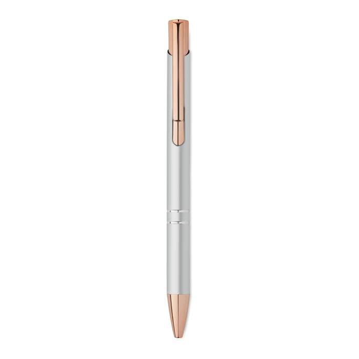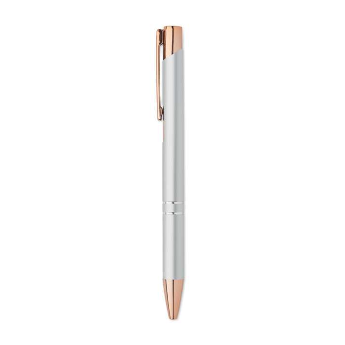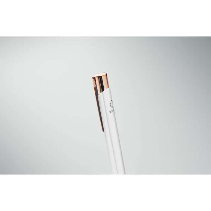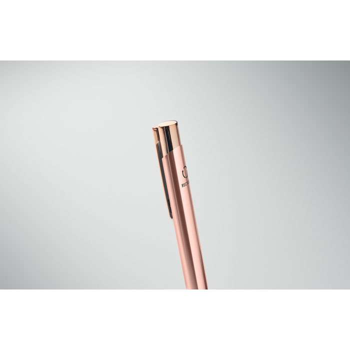Kulspetspenna med tryckknapp i återvunnen aluminium. Blått bläck.
