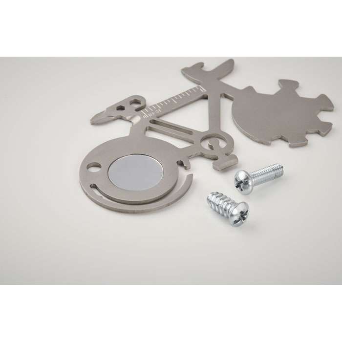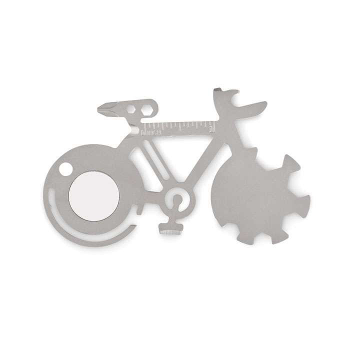 Multiverktyg 11-i-1 i rostfritt stål i cykelform. Från flasköppnare, kniv, linjal eller stjärn-skruvmejselverktyg.