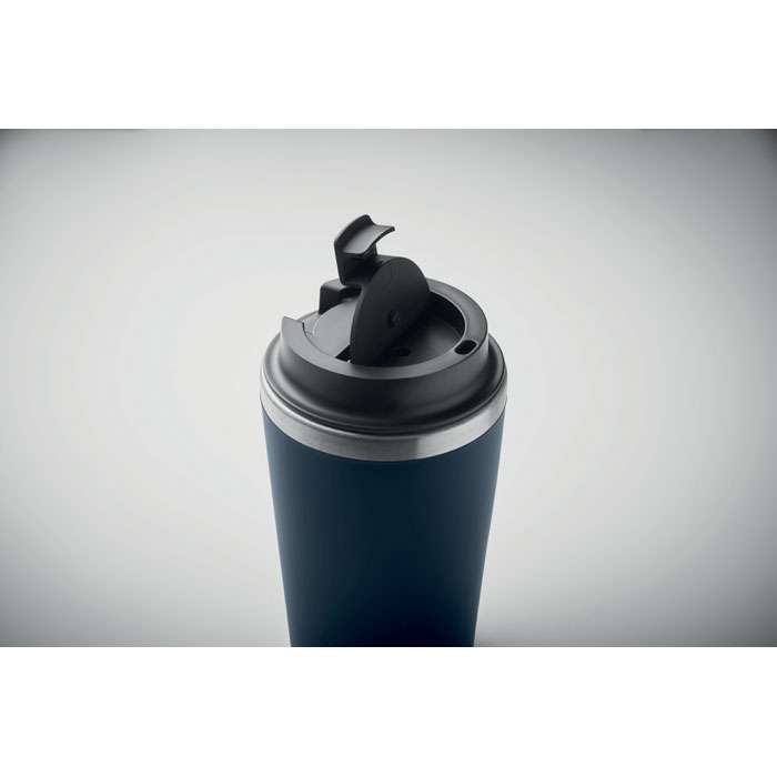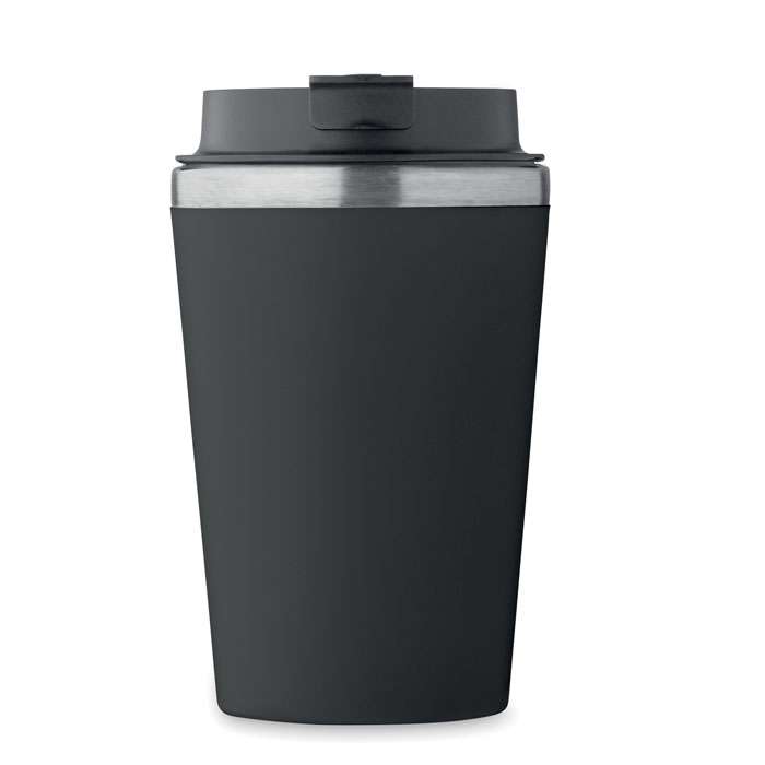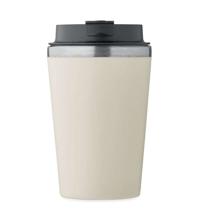 Dubbelväggig mugg med yttervägg i PP och innervägg i återvunnet rostfritt stål (90% återvunnet rostfritt stål och 10% rostfritt stål) med keramiskt coating. Läckagefri. Volym: 350 ml.