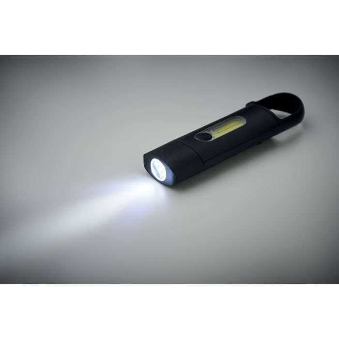 Uppladdningsbar COB-ficklampa i fickformat i ABS med karbinhake. Nödljus och 3 ljuslägen. 1 x 3,7 V, 200 mAh uppladdningsbart litiumbatteri (medföljer, kan inte bytas ut).