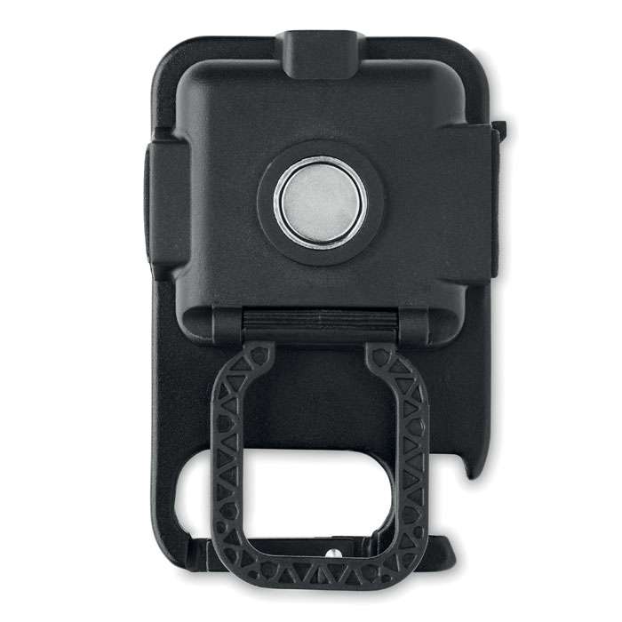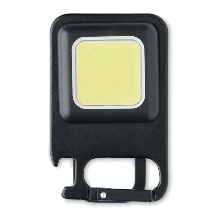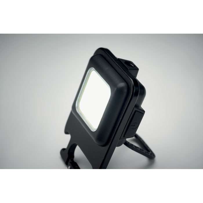 Multifunktionell mini COB ficklampa med magnet, karbinhake och flasköppnare. Data: 400 mAh USB uppladdningsbar aluminium 6W. Ljusflöde: 800 lm. 3 ljuslägen (hög, låg och blinkande).