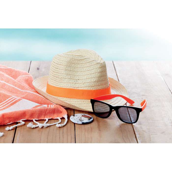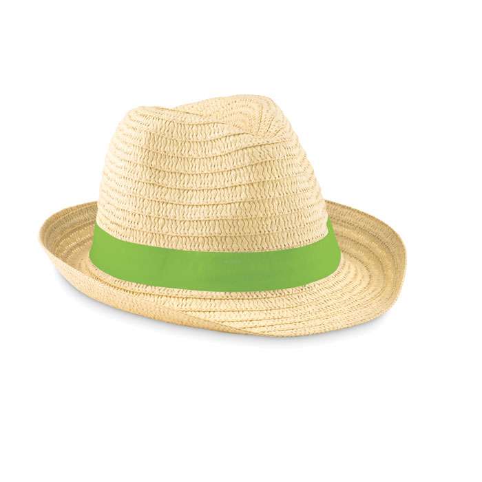 Stråhatt med färgat polyesterband. Vid otryckt order levereras banden omonterade på hatten. Onesize.