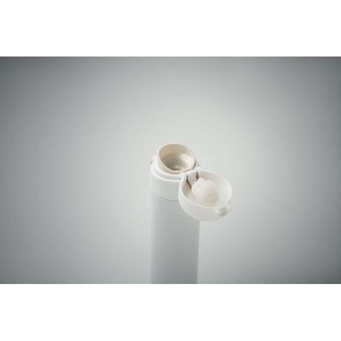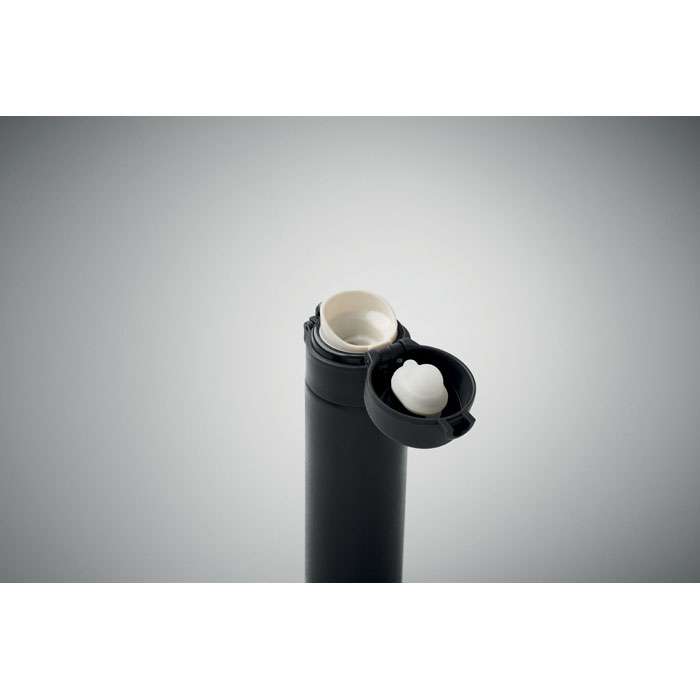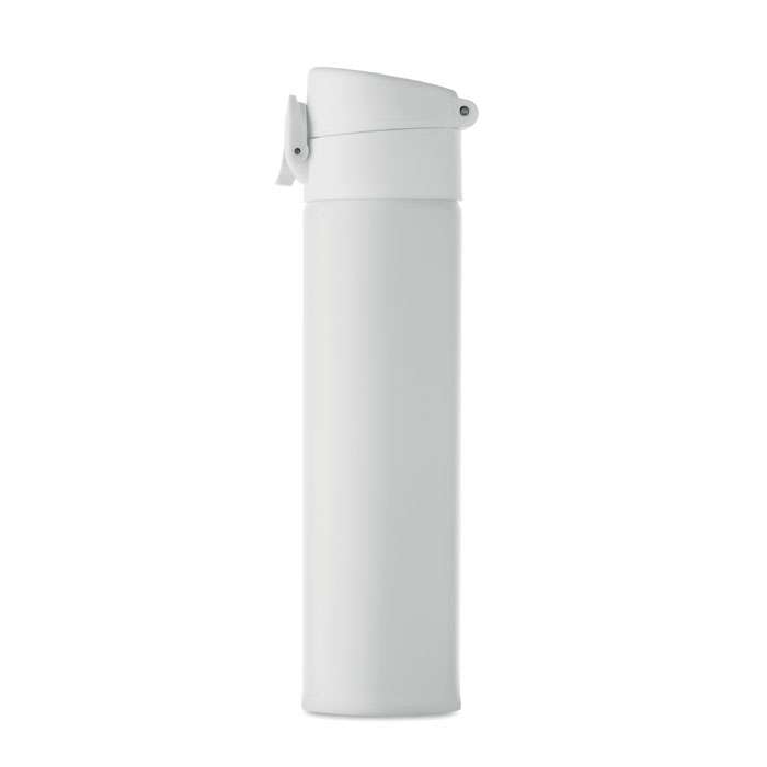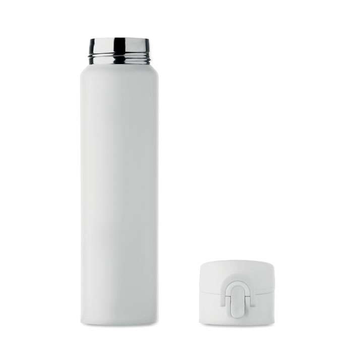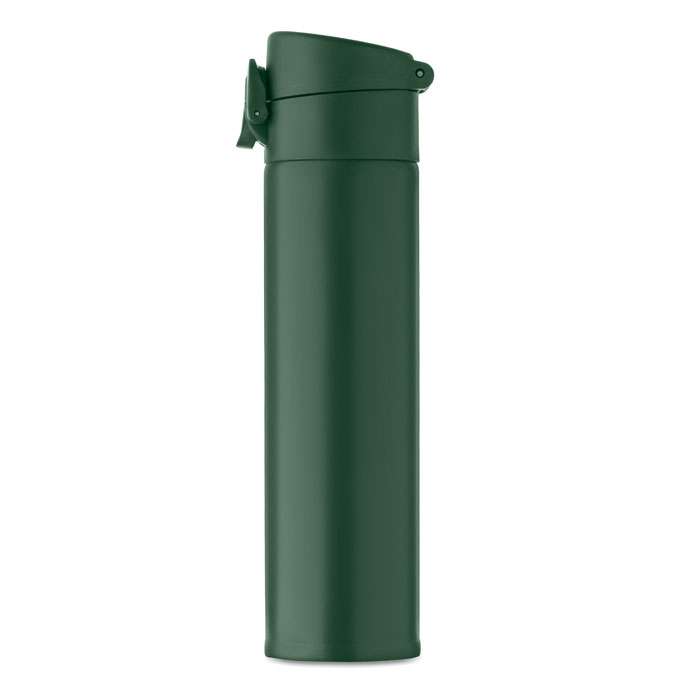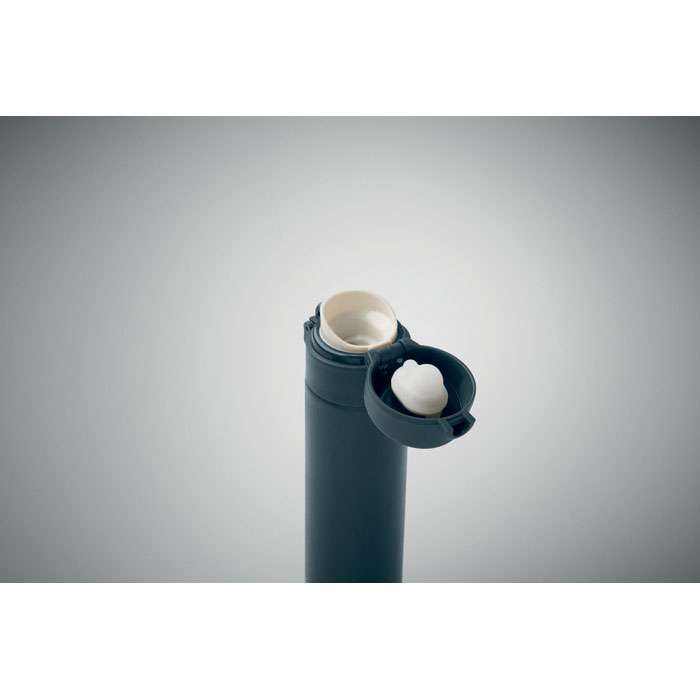 Dubbelväggig flaska i återvunnet rostfritt stål (90% återvunnet rostfritt stål och 10% rostfritt stål) med säkerhetslås på locket och möjlighet att öppna med tryckknapp. Läckagefri. Volym: 300 ml.