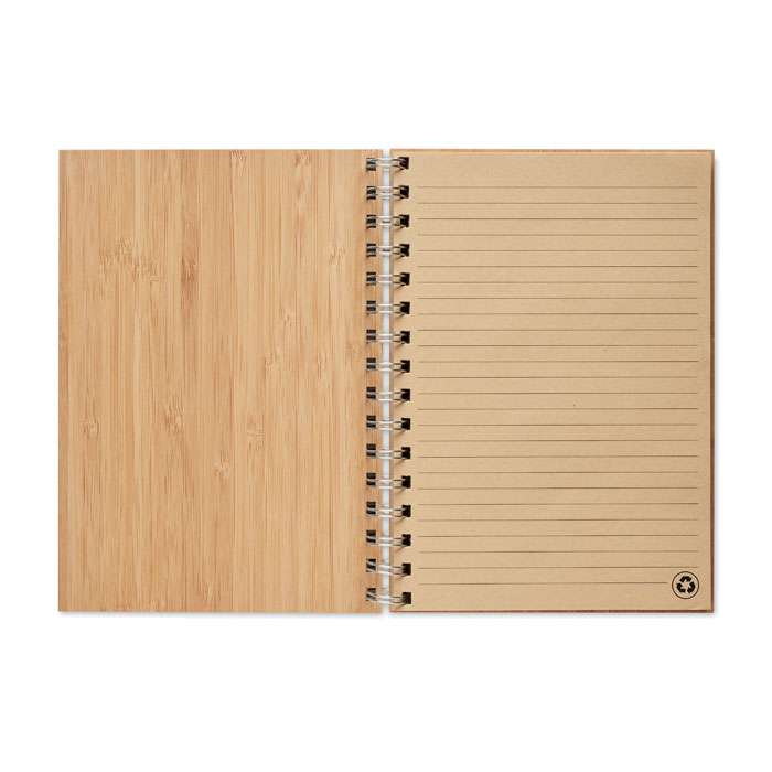 Notebook A5 med bambupärmar. Ringbunden med dubbla trådar, 140 linjerade sidor i kraftpapper (70 blad).