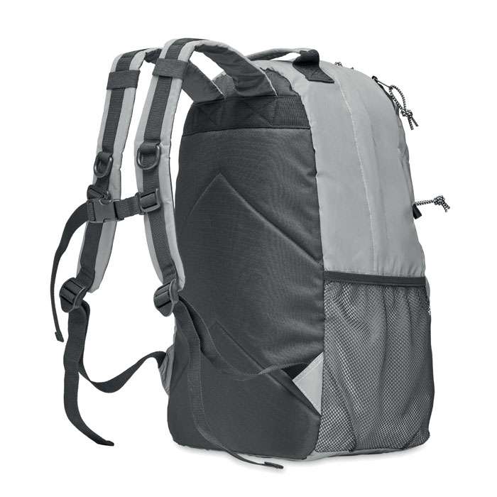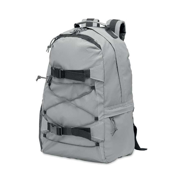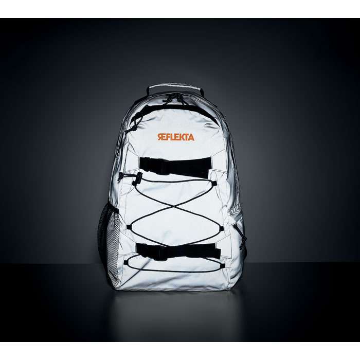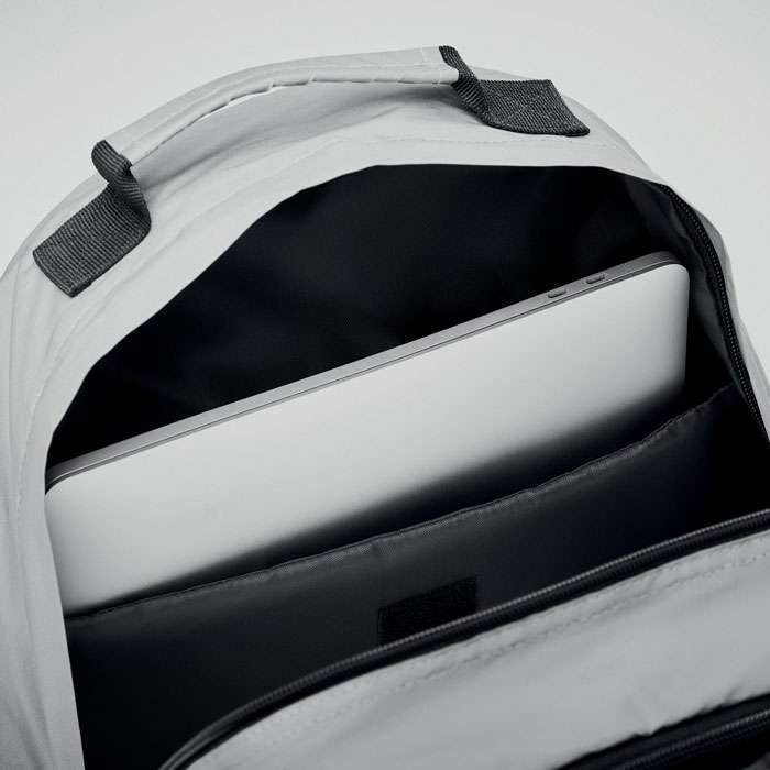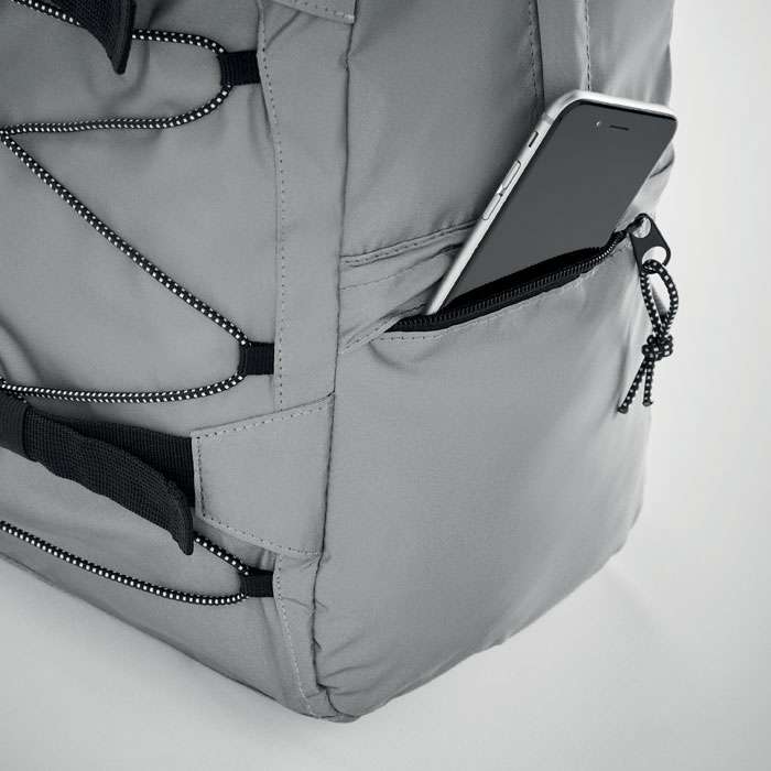 Ryggsäck i högreflekterande 190T polyester med snöre på framsidan. Vadderad rygg, remmar och botten. Den har ett fack för 15” bärbar dator. En nätficka på ena sidan och en ficka med dragkedja på den andra sidan.