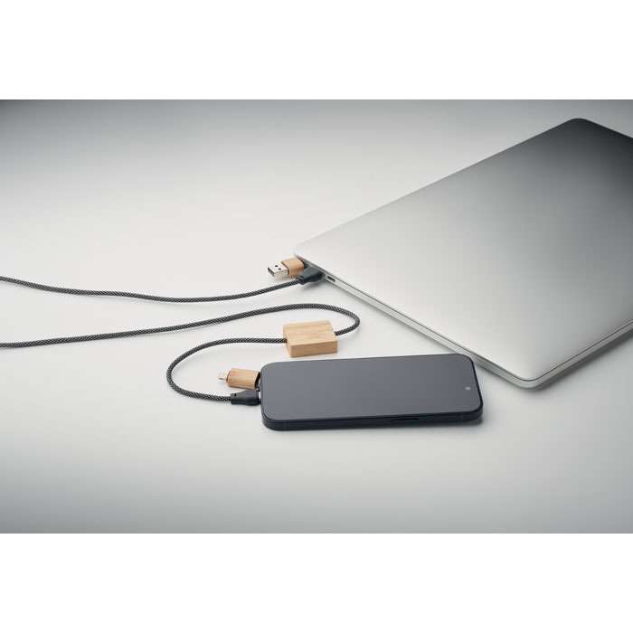 60W laddkabel i RPET med detaljer i bambu. Ingång: 2-i-1 Typ-C och Typ-A. Utgång: Typ-C och 2 i 1 stift.