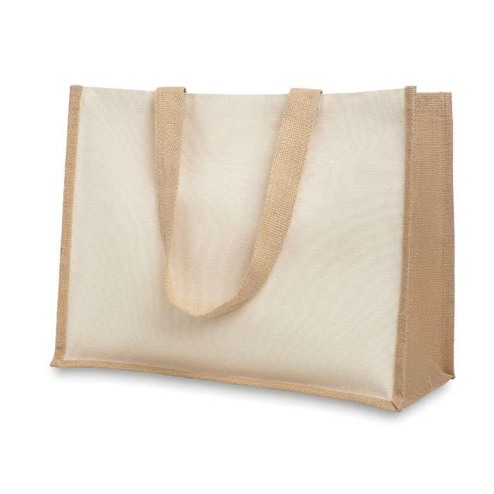 Shoppingkasse i laminerad Jute med front i canvas och bomull. Långa handtag. Denna produkt är certifierad enligt OEKO-TEX® STANDARD 100.