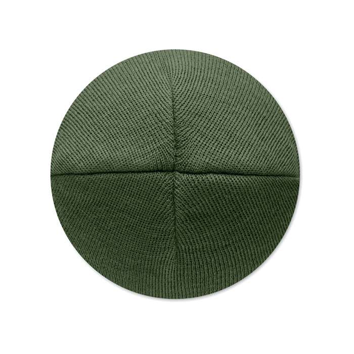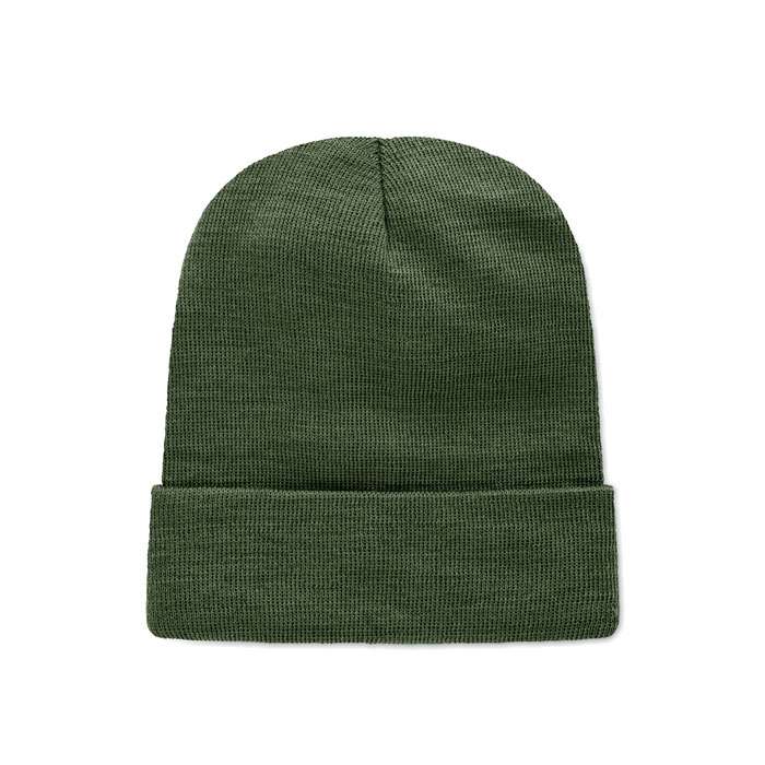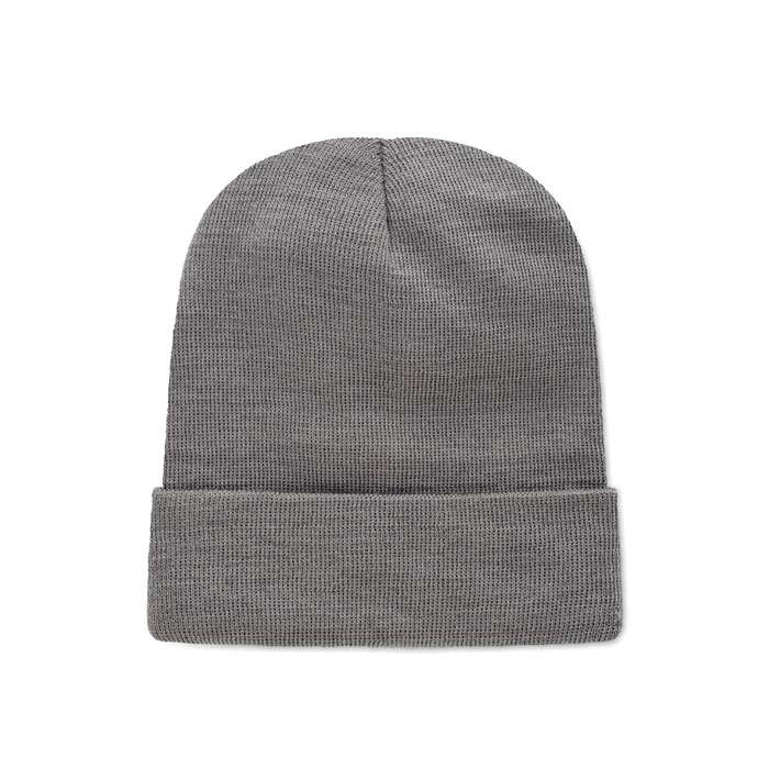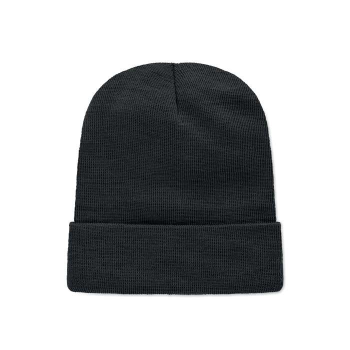 Unisexstickad mössa i mjuk stretchig RPET-polyester med mudd och lapp.