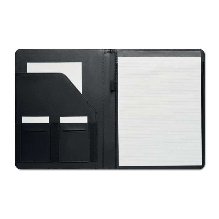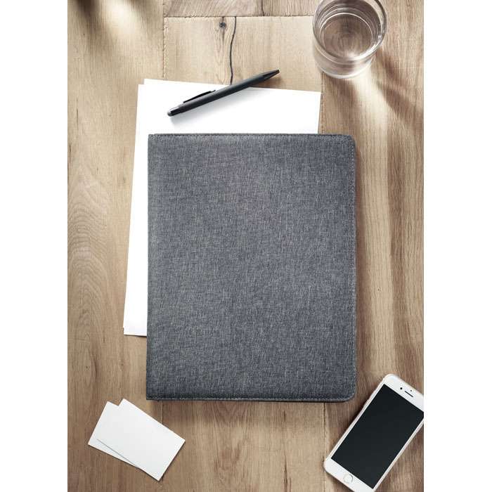 Konferensmapp i A4-storlek i tvåfärgad 300D RPET. Innehåller innerfack, pennhållare och block med 20st linjerat ark.
