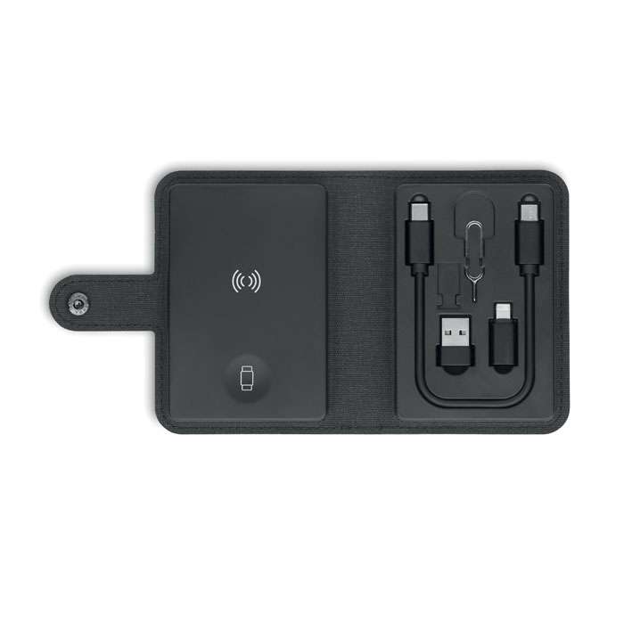 Kontakadapterset med trådlös laddare 15W och klockladdare (endast Apple®). 4 i 1 laddningskabel och simkortsverktyg. Hölje i återvunnen PU+RPET, plast i återvunnen ABS och platta i återvunnen aluminium.
