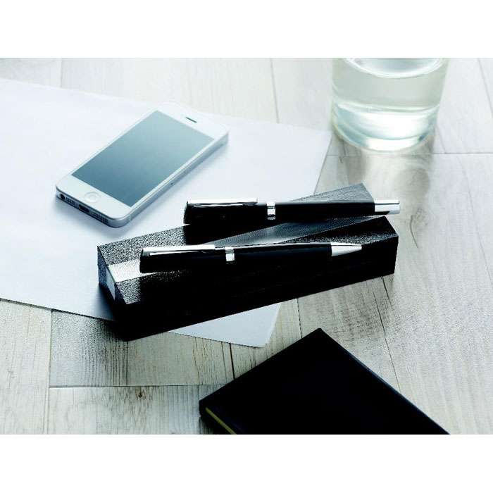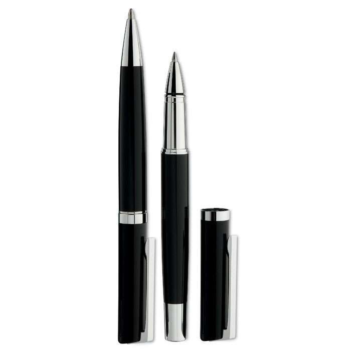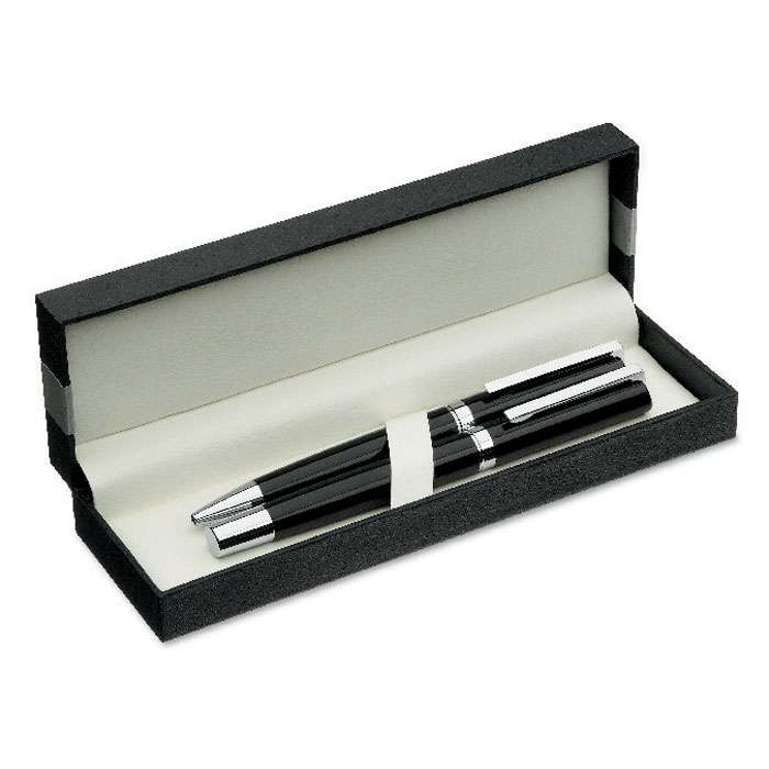 Pennset i exklusiv presentförpackning. Kulspetspenna med vridmekanism och Rollerballpenna. Rulle: Svart bläck och penna: Blått bläck