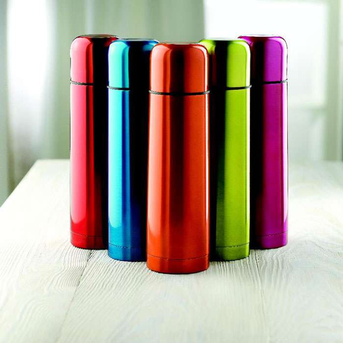Termos i lackat rostfritt stål. Dubbelväggskonstruktion med integrerad mugg i locket. Smidigt auto open/close pip för att behålla värmen. Rymmer 500 ml. Läckagefritt.