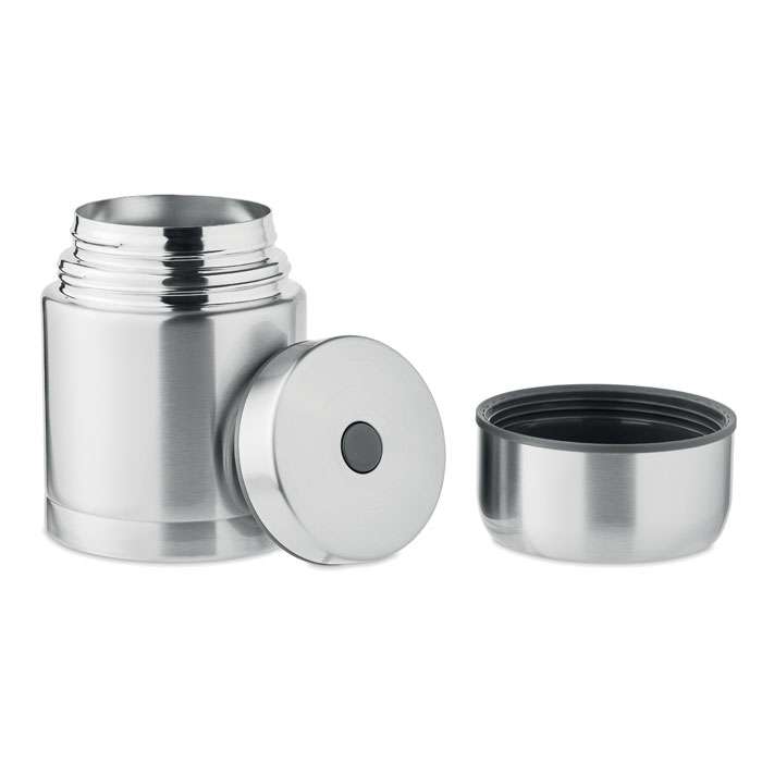 Snygg mattermos i rostfritt stål och skruvlock med tätningsring. Har dubbelvägg för bästa isolering och håller maten varm eller kall under uteaktiviteter. Locket kan användas som matkärl. Volym: 800 ml. Tål diskmaskin. Endast Lasergravyr