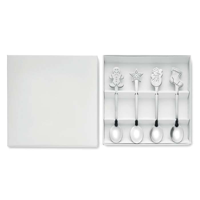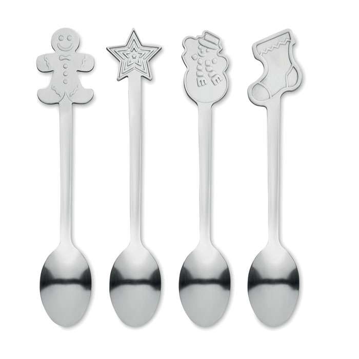 Uppsättning med 4 olika teskedar med julmotiv i rostfritt stål. Presenteras i presentförpackning.