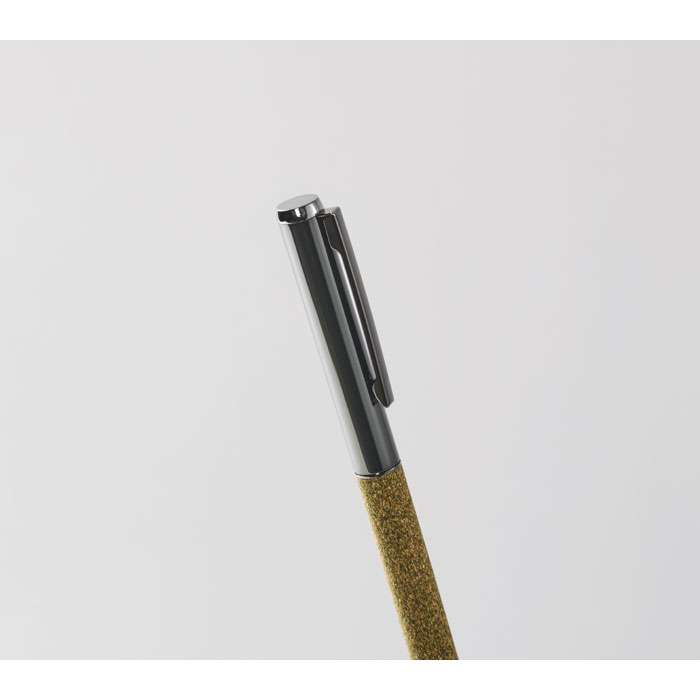 Twistpenna med tyg på skaftet tillverkade av 20% tesump, 30% kork, 50% TC polycotton tyg i kartong. Blått bläck.