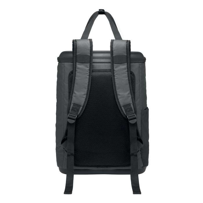 Kylryggsäck tillverkad av vattenavvisande 600D RPET med PE-skumisolering och PEVA-foder. Med formgjutet lock, vadderad rygg i mesh, frontficka med dragkedja och sidofickor i mesh. Volym 20 liter.