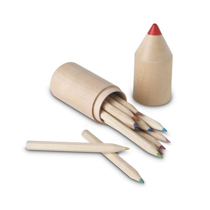 12 st färgpennor i trä förpackad i pennformad trälåda.