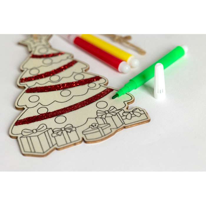 Julgransprydnad i poppelträ med 3 färgpennor och jutesnöre.