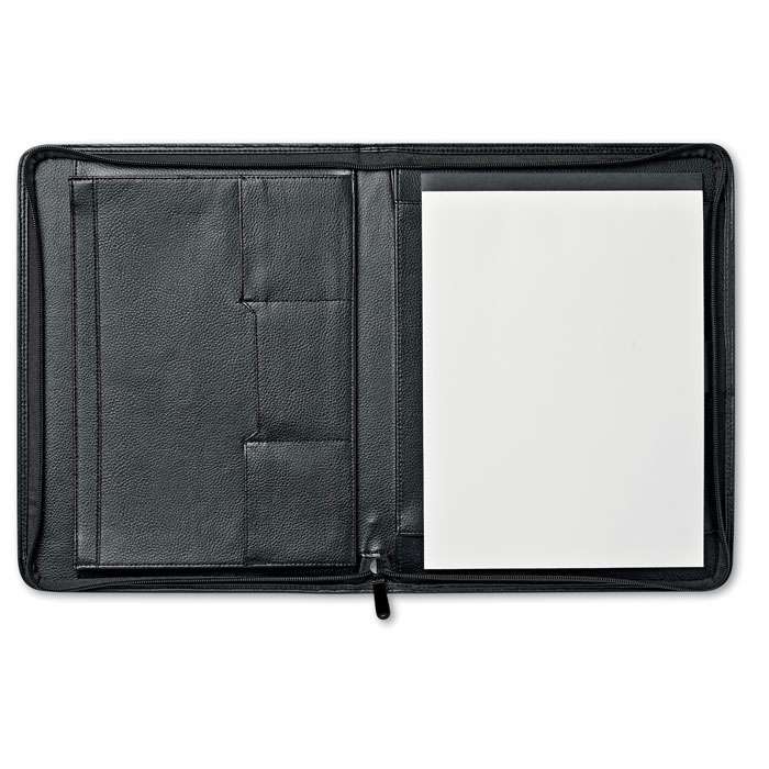 Konferensmapp med dragkedja i läder med PU material invändigt. Innerfack och pennögla. Anteckningsblock A4 med 25 blanka blad.
