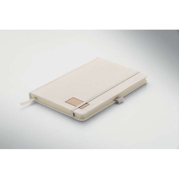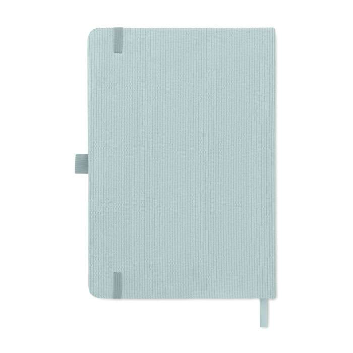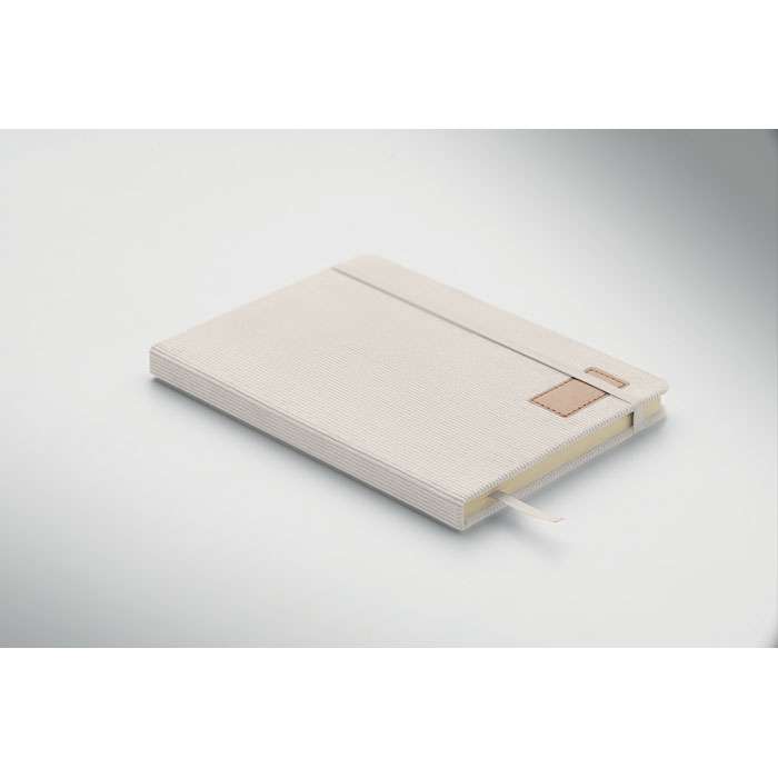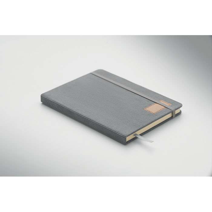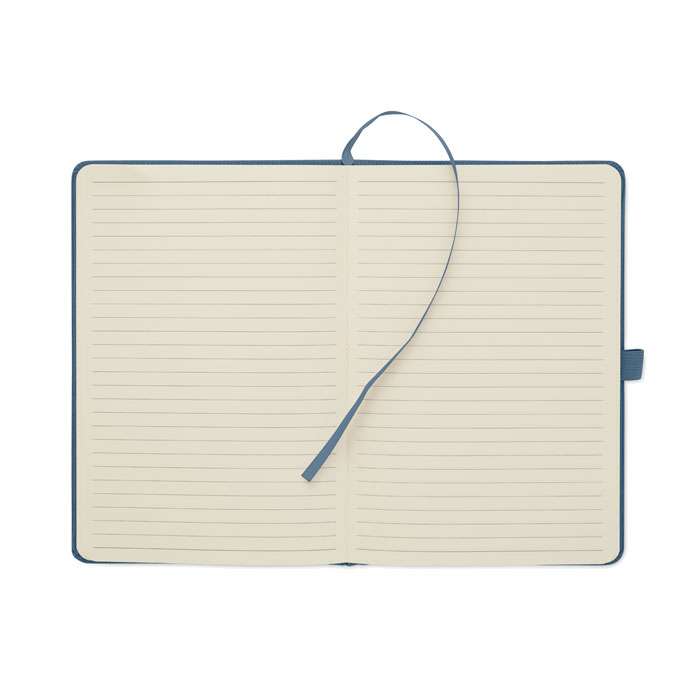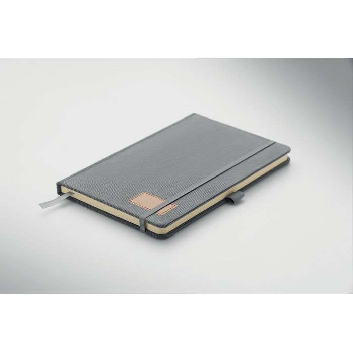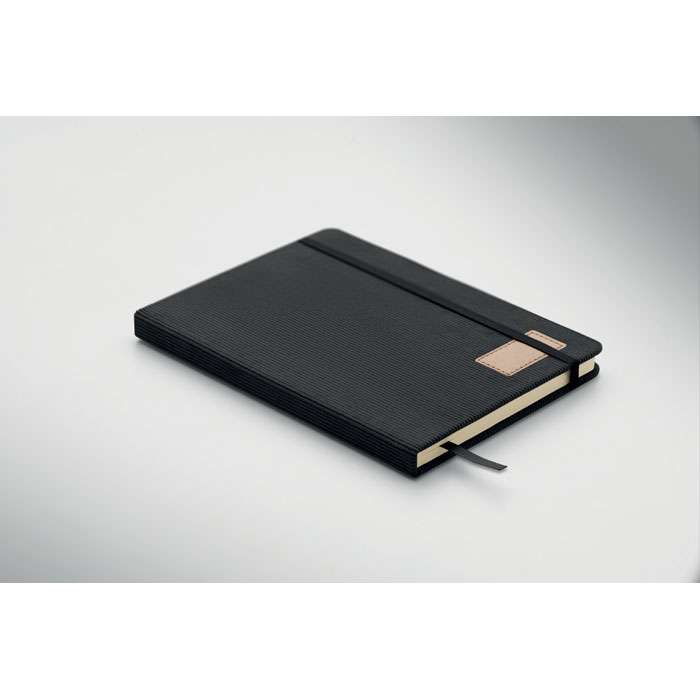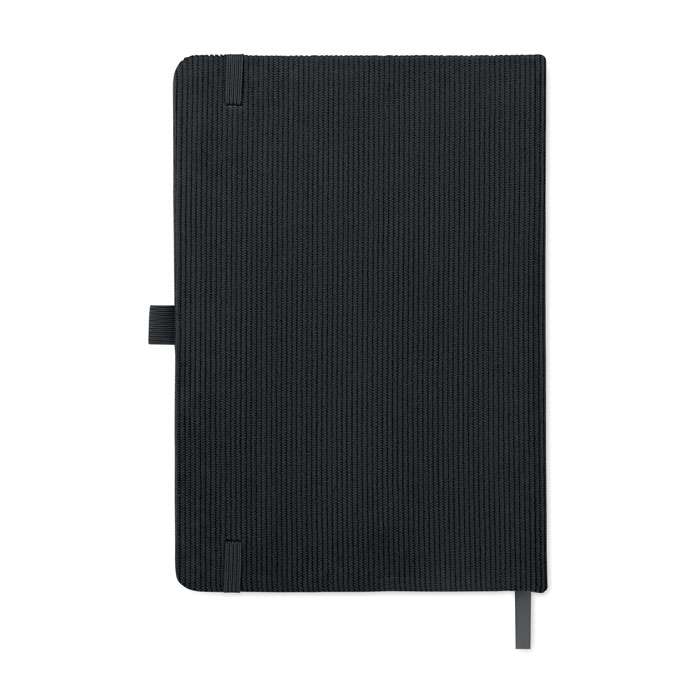 A5-anteckningsbok med hårt RPET-polyesterpärm i manchester och 192 linjerade sidor av återvunnet papper (70 gr/m2). Bunden med elastisk band, pennögla, sidmarkörsband och tagg i tvättat kraftpapper.