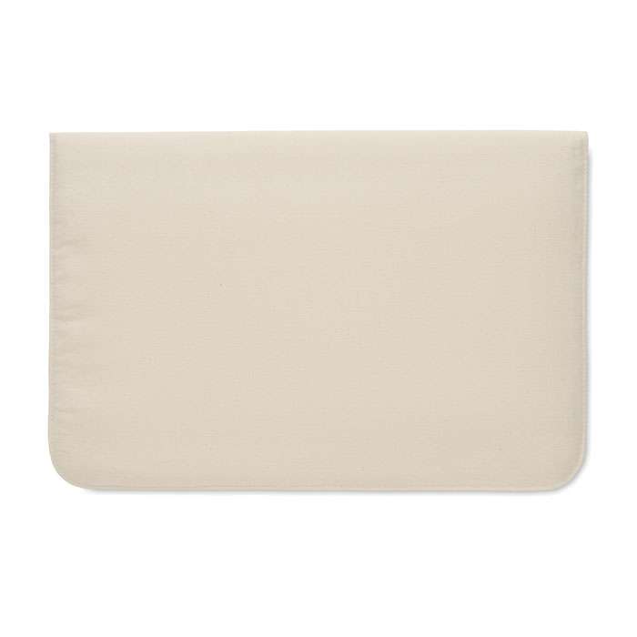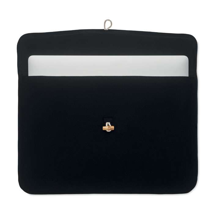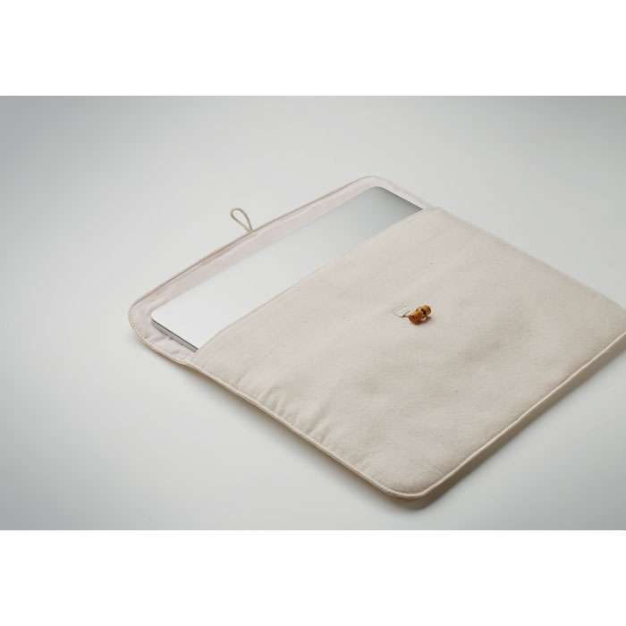 Vadderad 15-tumsväska för laptop i 220 gr/m² bomull. Innerfoder 120 gr/m². Stängning med bambuknapp.