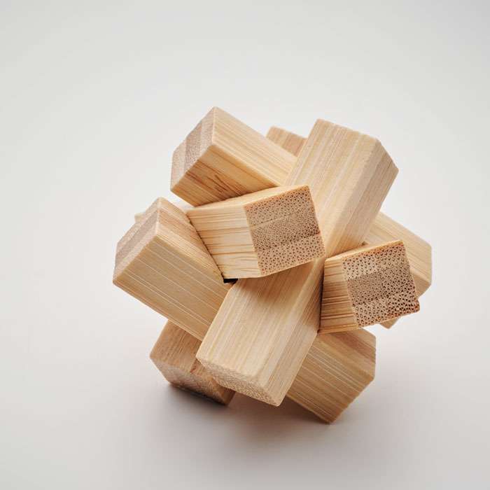 Hjärngympa spel i bambu i form av en stjärna. Presenteras i en kartong av återvunnet papper.