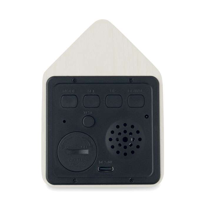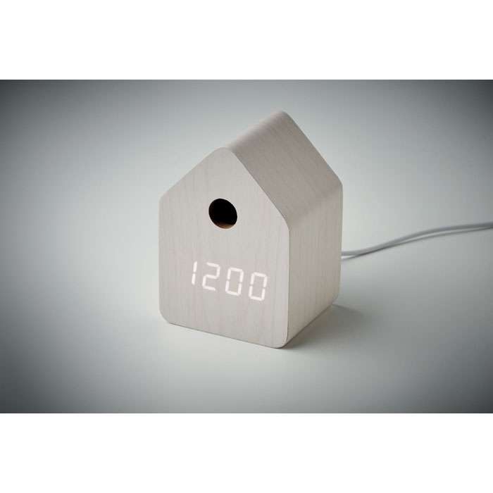 Liten bordsklocka i MDF med inbyggt alarm med fågelgökröst och temperaturvisning. Vit LED-display. Ljudet tystnar automatiskt mellan 22.00h och 06.00h. 5 minuters snooze-intervaller