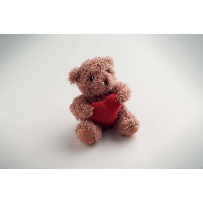 Nallebjörn av polyester som håller i ett rött hjärta, broderade ögon, näsa och mun.